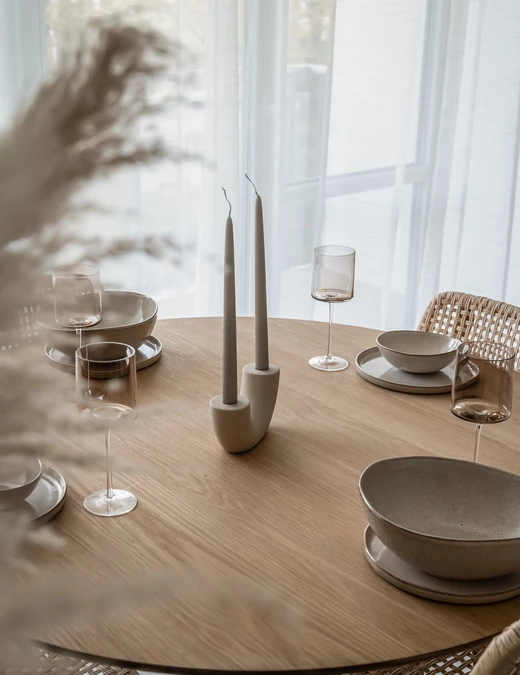 Ograniczono się zatem do koloru naturalnego dębu, godząc się na wszystkie jego naturalne niedoskonałości i przebarwienia, oraz do subtelnych beży oraz brązów. Te kolory grają główną rolę w koncepcji. Pochodzą z natury, dzięki czemu pozytywnie wpływają na samopoczucie, łagodzą stres oraz działają odprężająco.