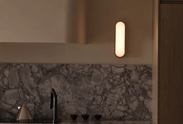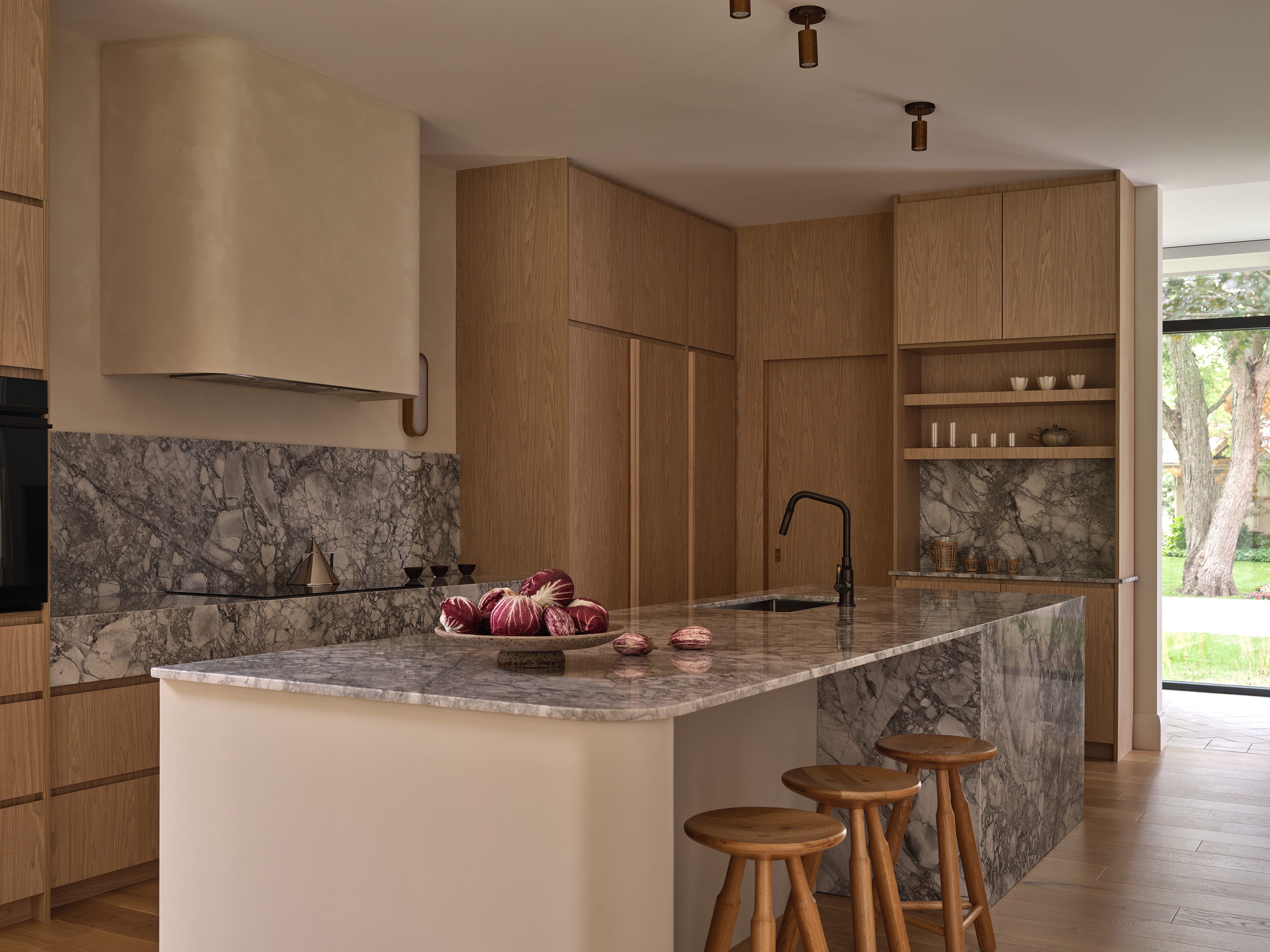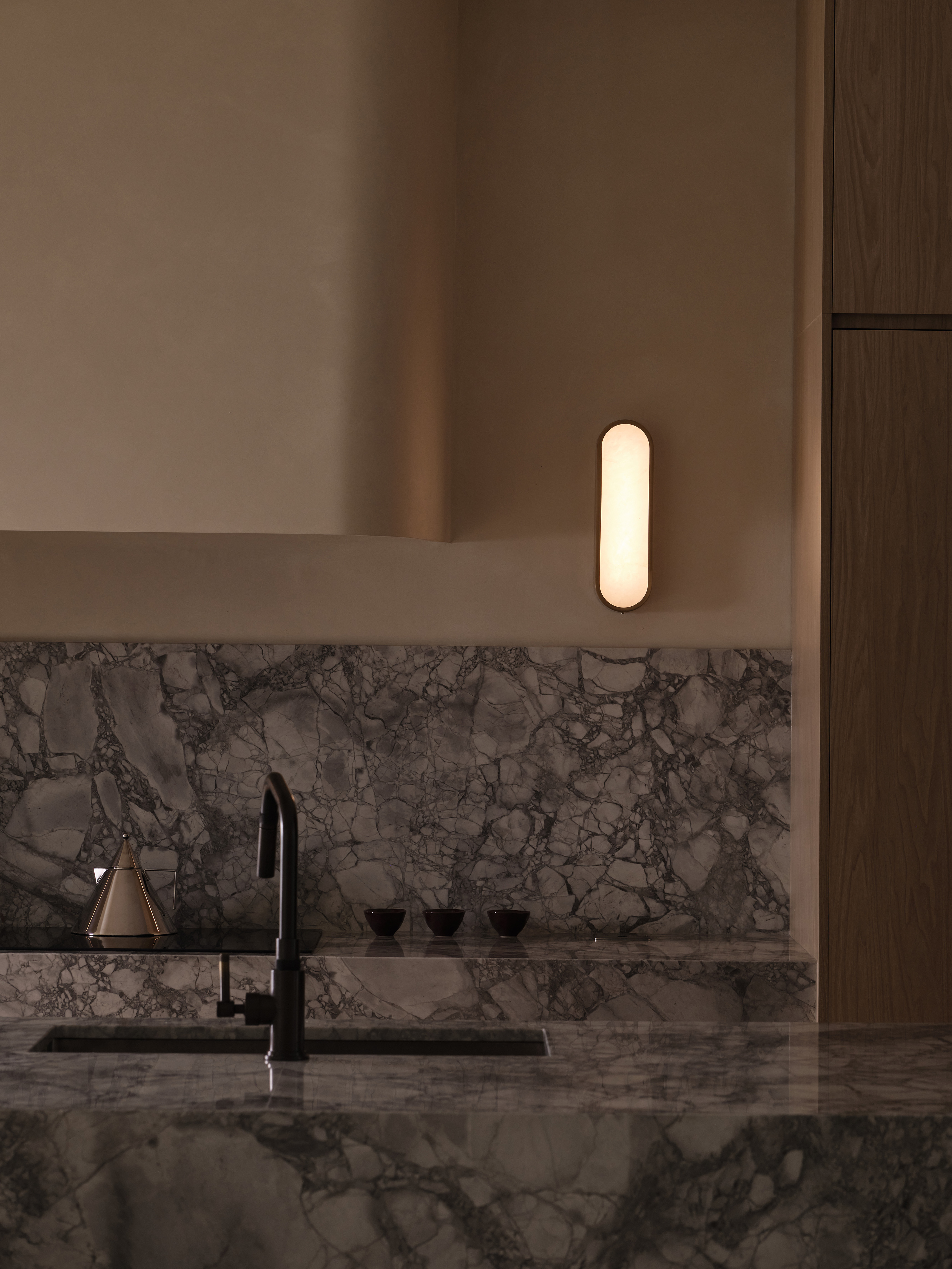 Tę spokojną ciągłość przełamują subtelne, celowe asymetrie. Zauważamy je w formie wyspy kuchennej, której jedna zaokrąglona noga balansuje z ciężkim kamiennym blokiem po drugiej stronie, czy w proporcjach opraw oświetleniowych. Wprowadzają one wizualne zainteresowanie, nie zakłócając jednak ogólnej harmonii.