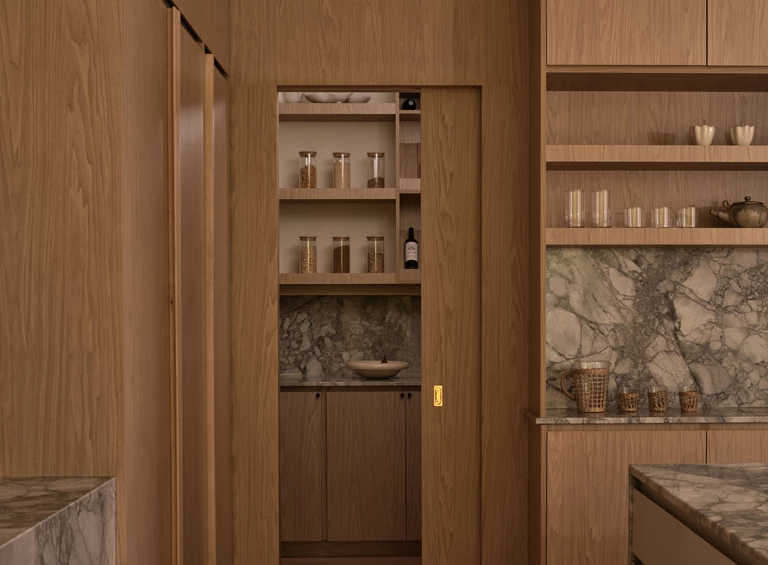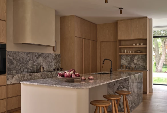 We wnętrzu panuje powściągliwa paleta materiałów. LN Studio postawiło na absolutną spójność, wykorzystując ciepłe odcienie drewna, wyrazisty marmur Arabescato oraz naturalne faktury lnu i delikatnych, prześwitujących zasłon.