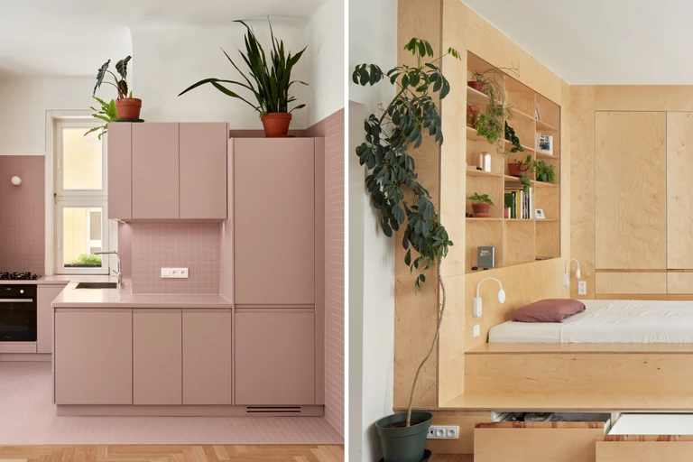 Ostatecznie w pokoju dominują dwa główne elementy. Po prawej stronie od wejścia znajduje się jasnoróżowa kuchnia z lakierowanej płyty MDF. Po drugiej stronie umieszczono wielofunkcyjne podium ze sklejki brzozowej. Ta wykonana na wymiar zabudowa pełni jednocześnie rolę łóżka, schowka, regału na książki, garderoby oraz ławy.