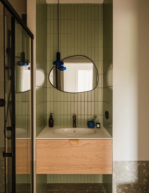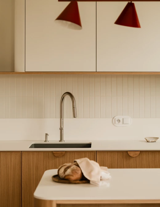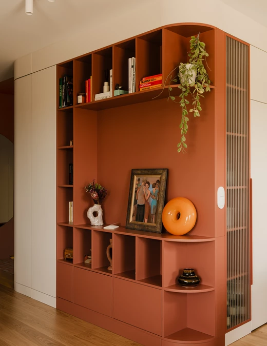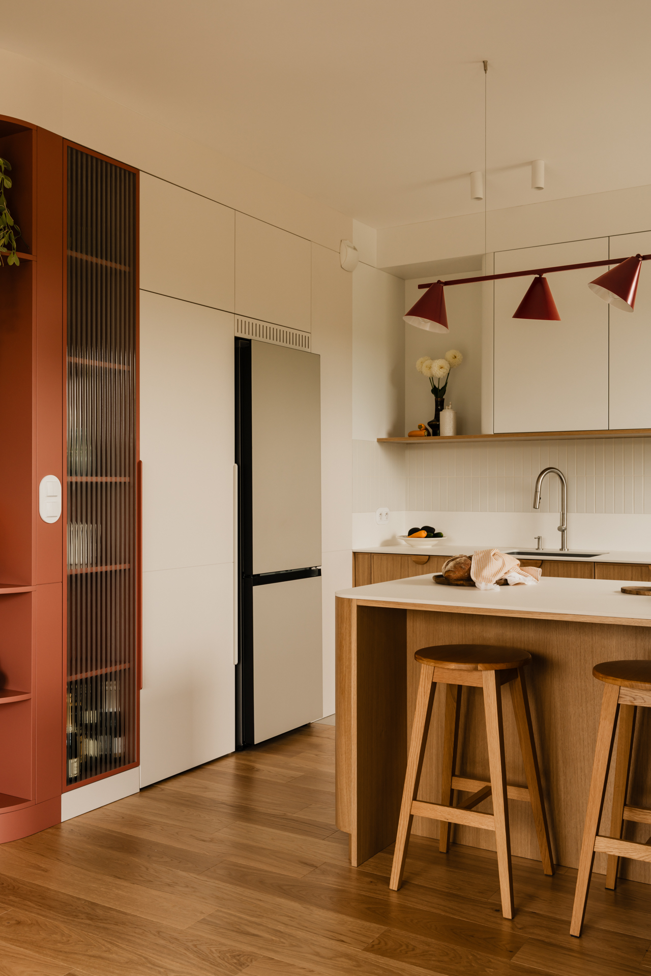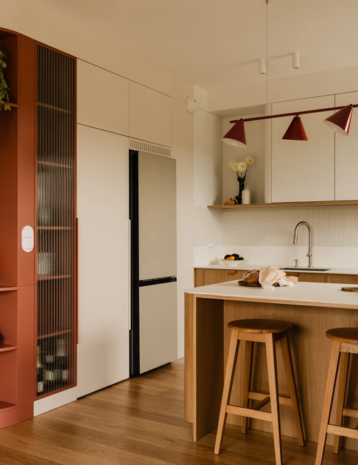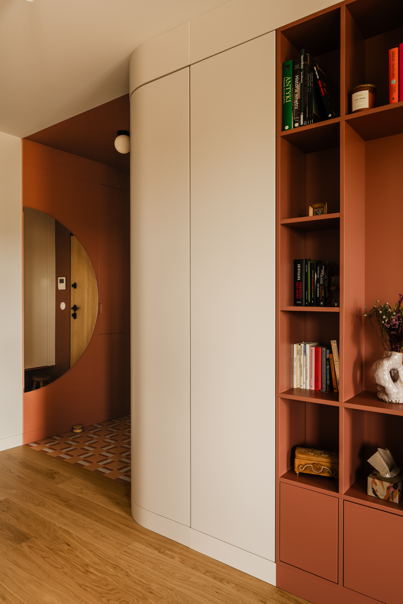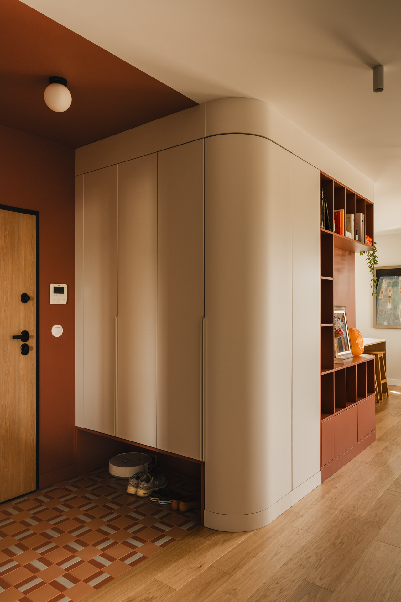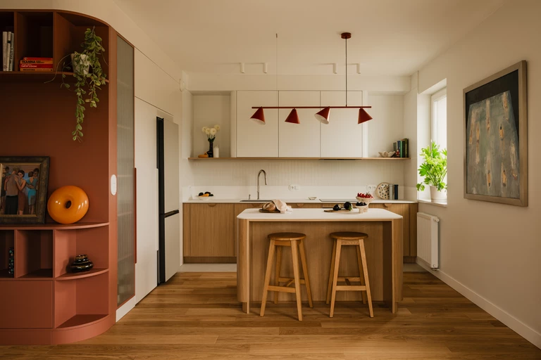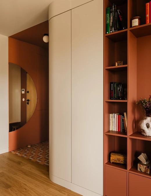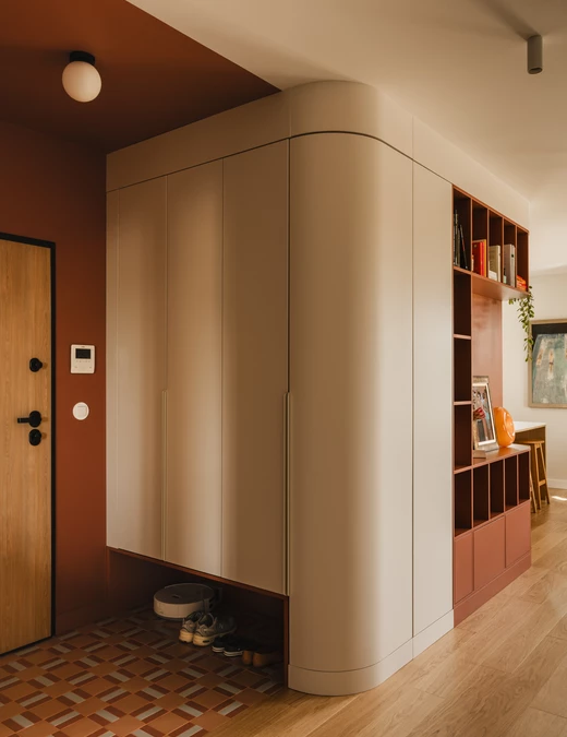 Projekt opiera się na lekkiej, stonowanej bazie kolorystycznej, która pozwala w pełni wybrzmieć detalom. Ceglasto-czerwone zabudowy ocieplają przestrzeń, geometryczne płytki w strefie wejściowej dodają rytmu, a zieleń w łazience przełamuje tło i niesie świeżość.
