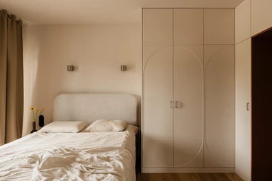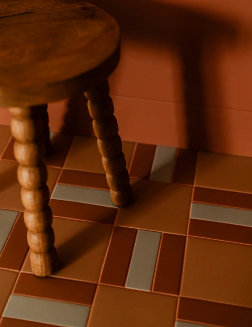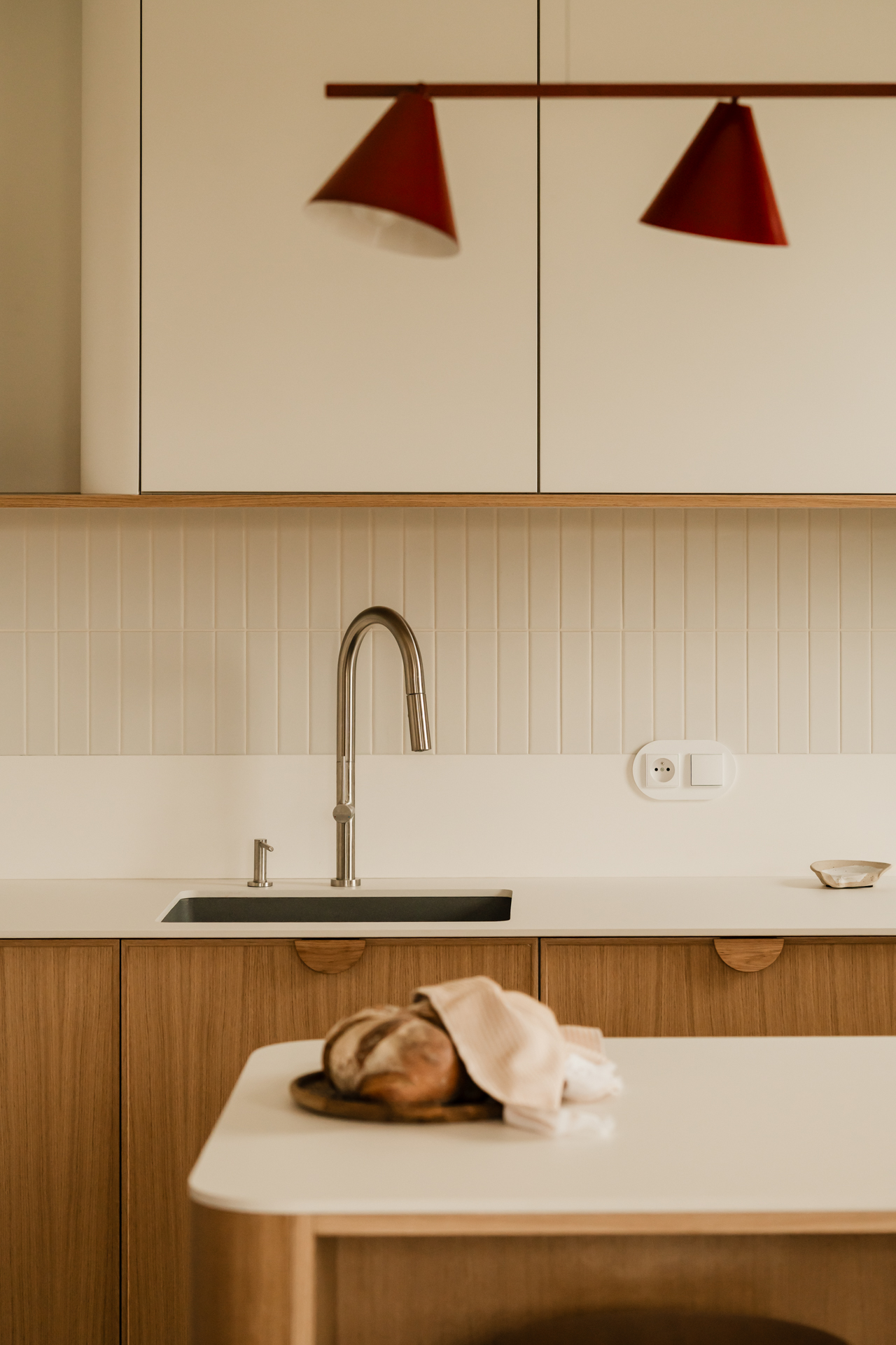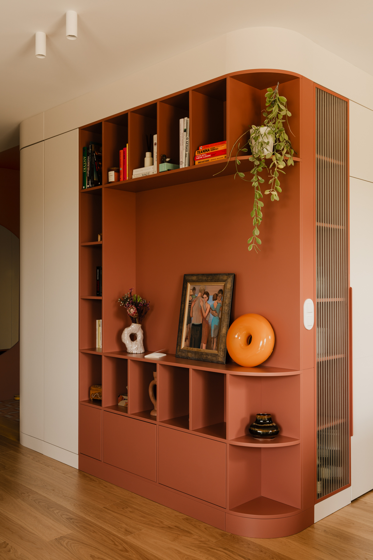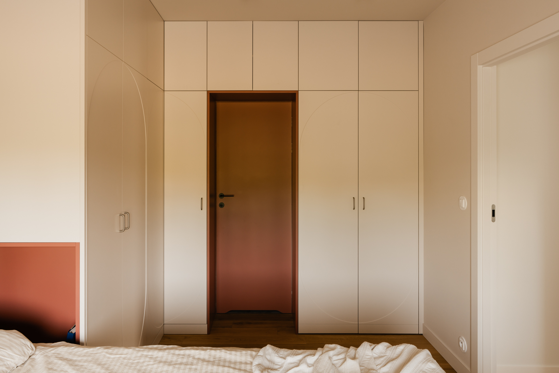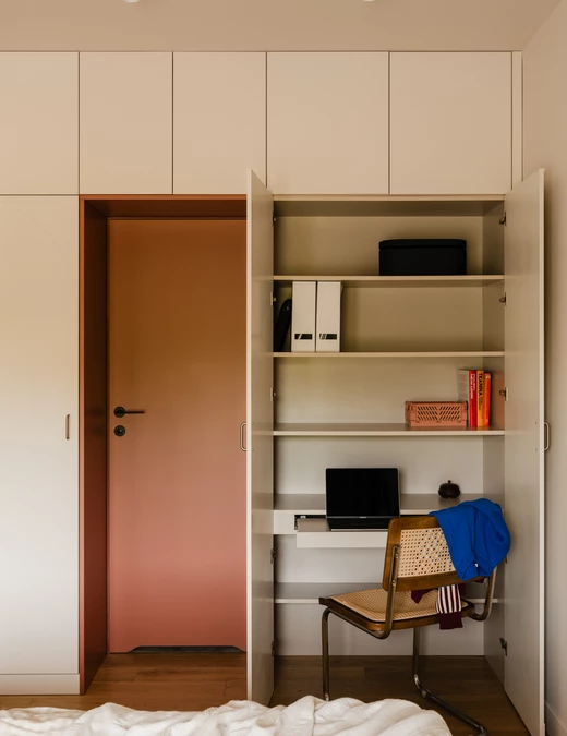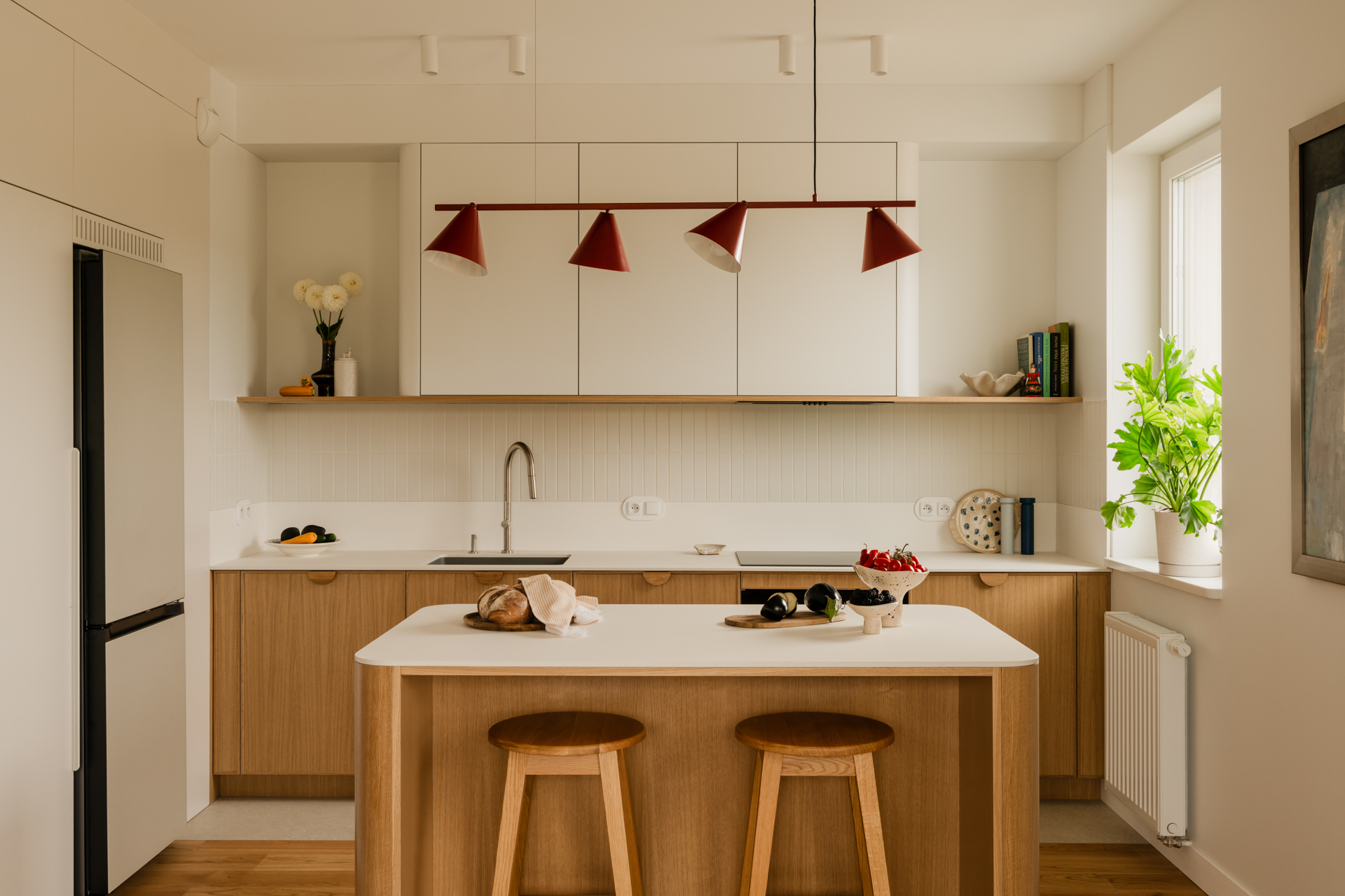 Projekt opiera się na lekkiej, stonowanej bazie kolorystycznej, która pozwala w pełni wybrzmieć detalom. Ceglasto-czerwone zabudowy ocieplają przestrzeń, geometryczne płytki w strefie wejściowej dodają rytmu, a zieleń w łazience przełamuje tło i niesie świeżość.
