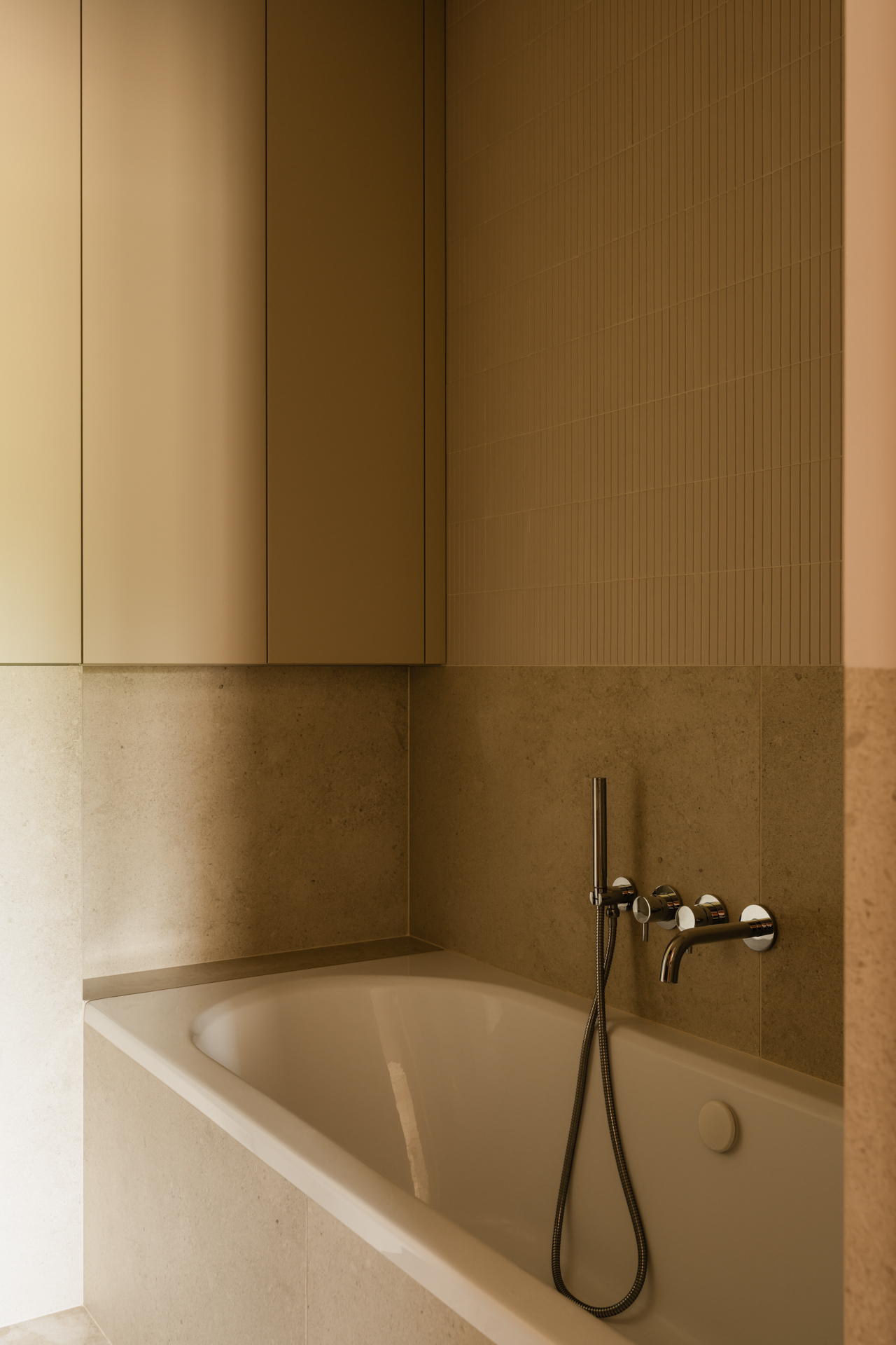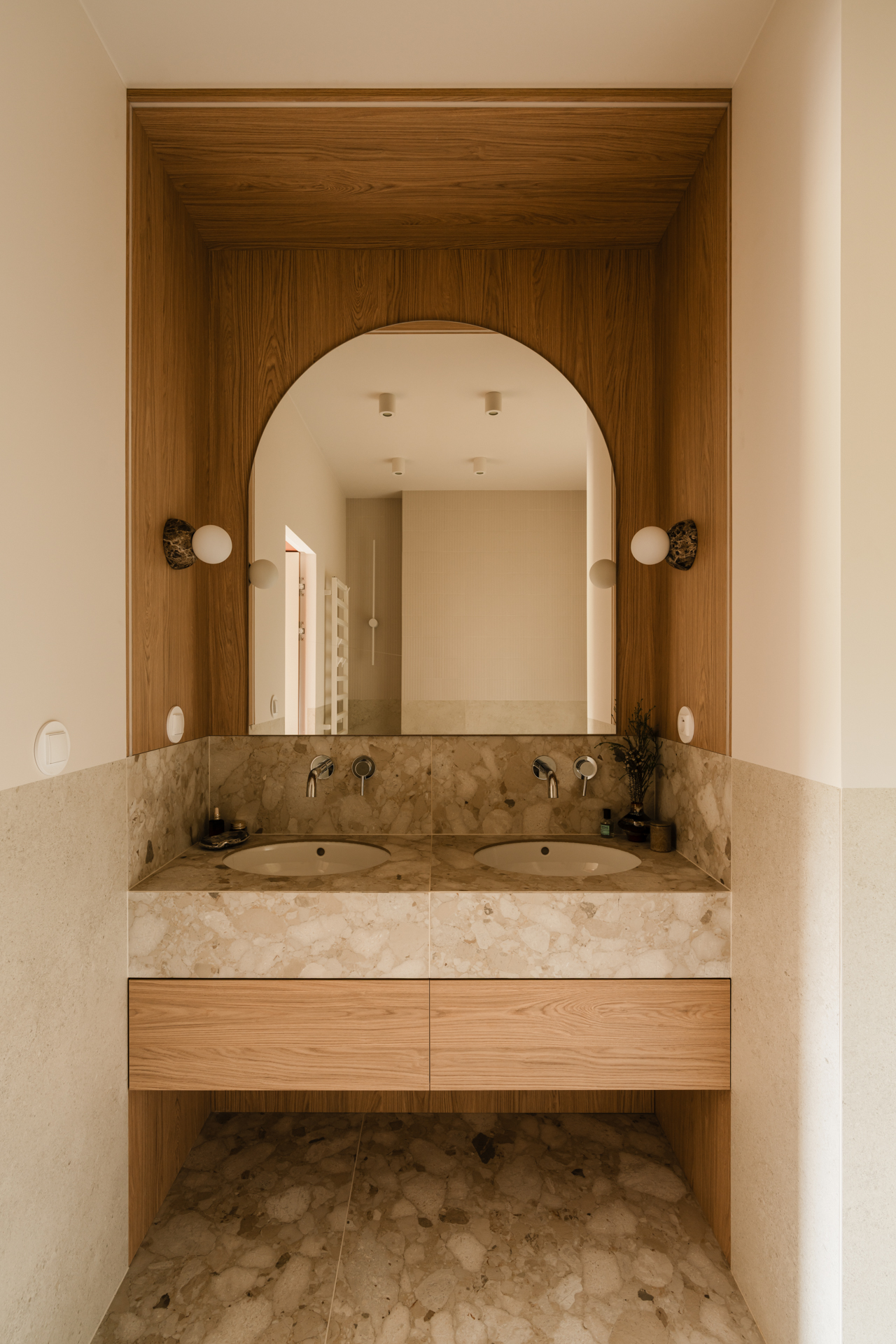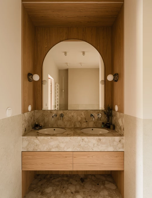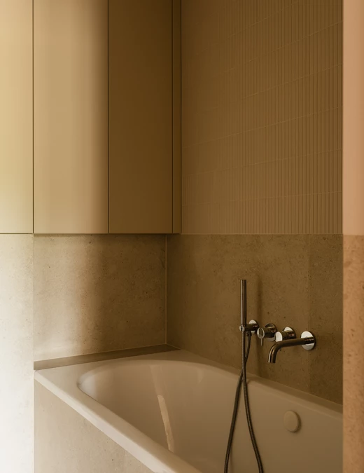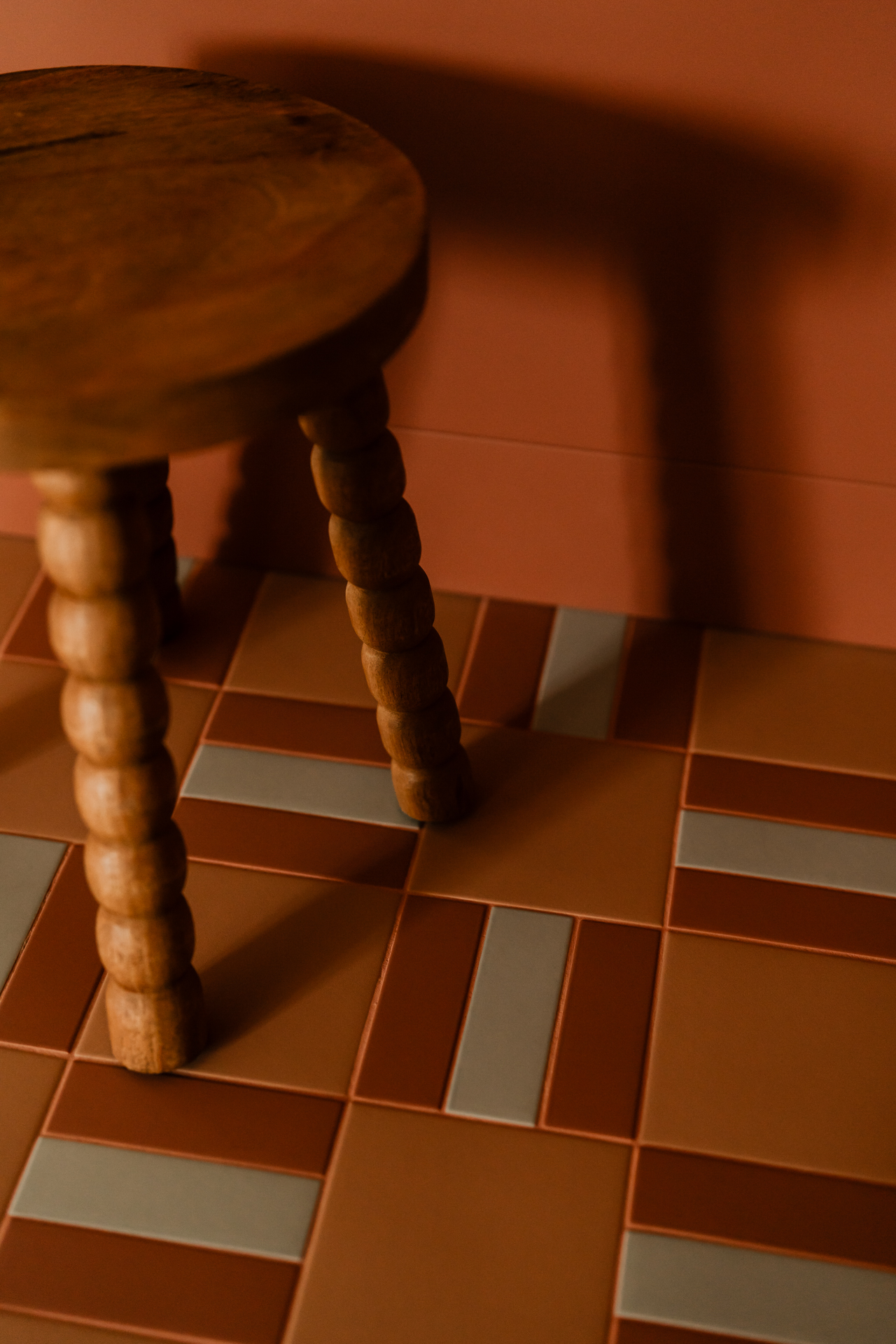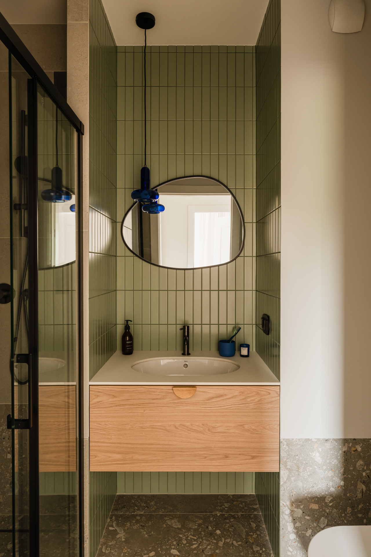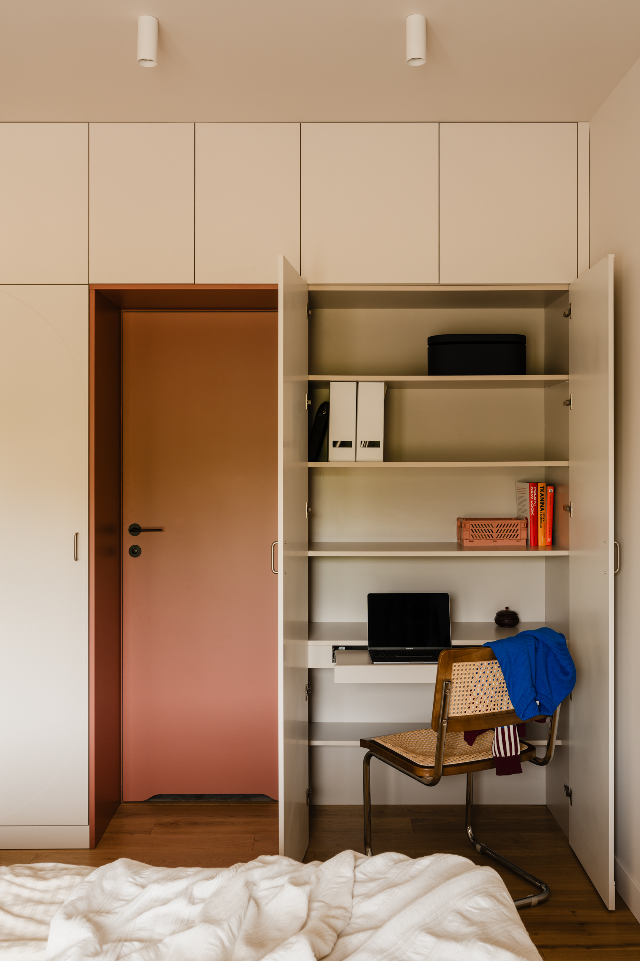 Projekt opiera się na lekkiej, stonowanej bazie kolorystycznej, która pozwala w pełni wybrzmieć detalom. Ceglasto-czerwone zabudowy ocieplają przestrzeń, geometryczne płytki w strefie wejściowej dodają rytmu, a zieleń w łazience przełamuje tło i niesie świeżość.