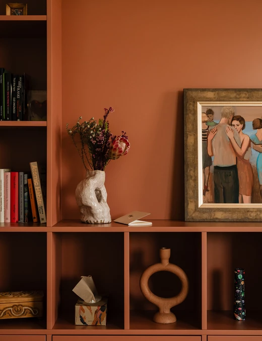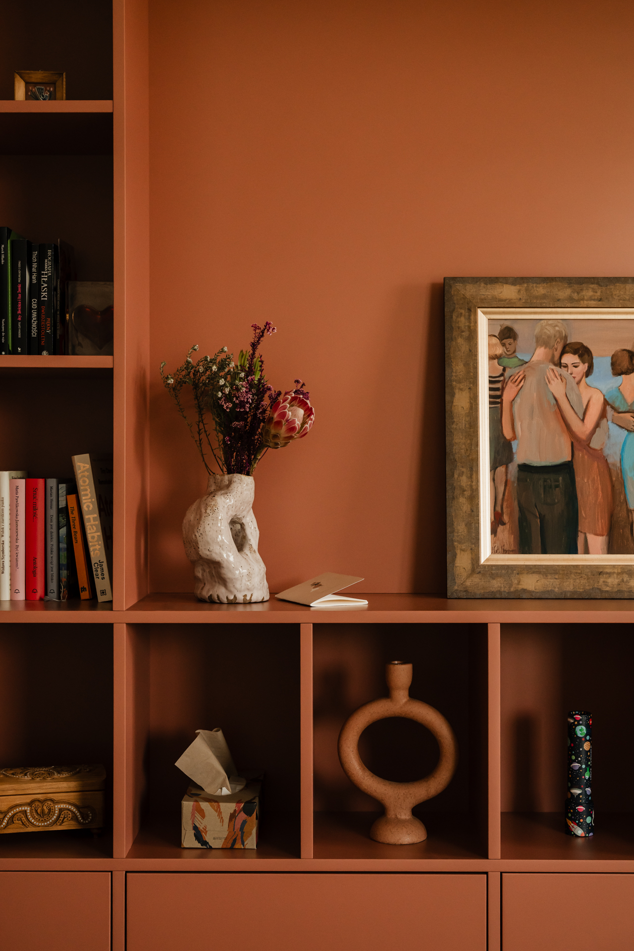 Ważnym elementem projektu było uwzględnienie pasji inwestorki związanej z ceramiką. W mieszkaniu znalazło się miejsce na ekspozycję jej własnych prac.