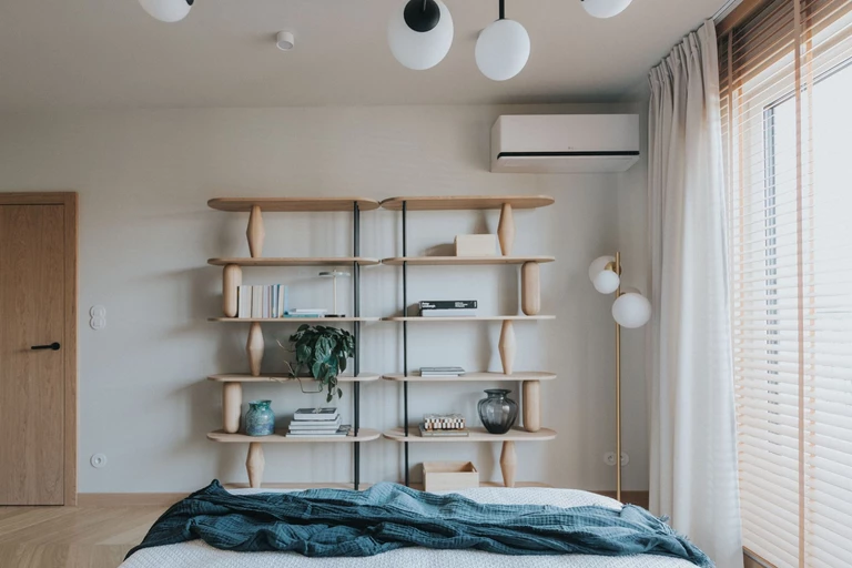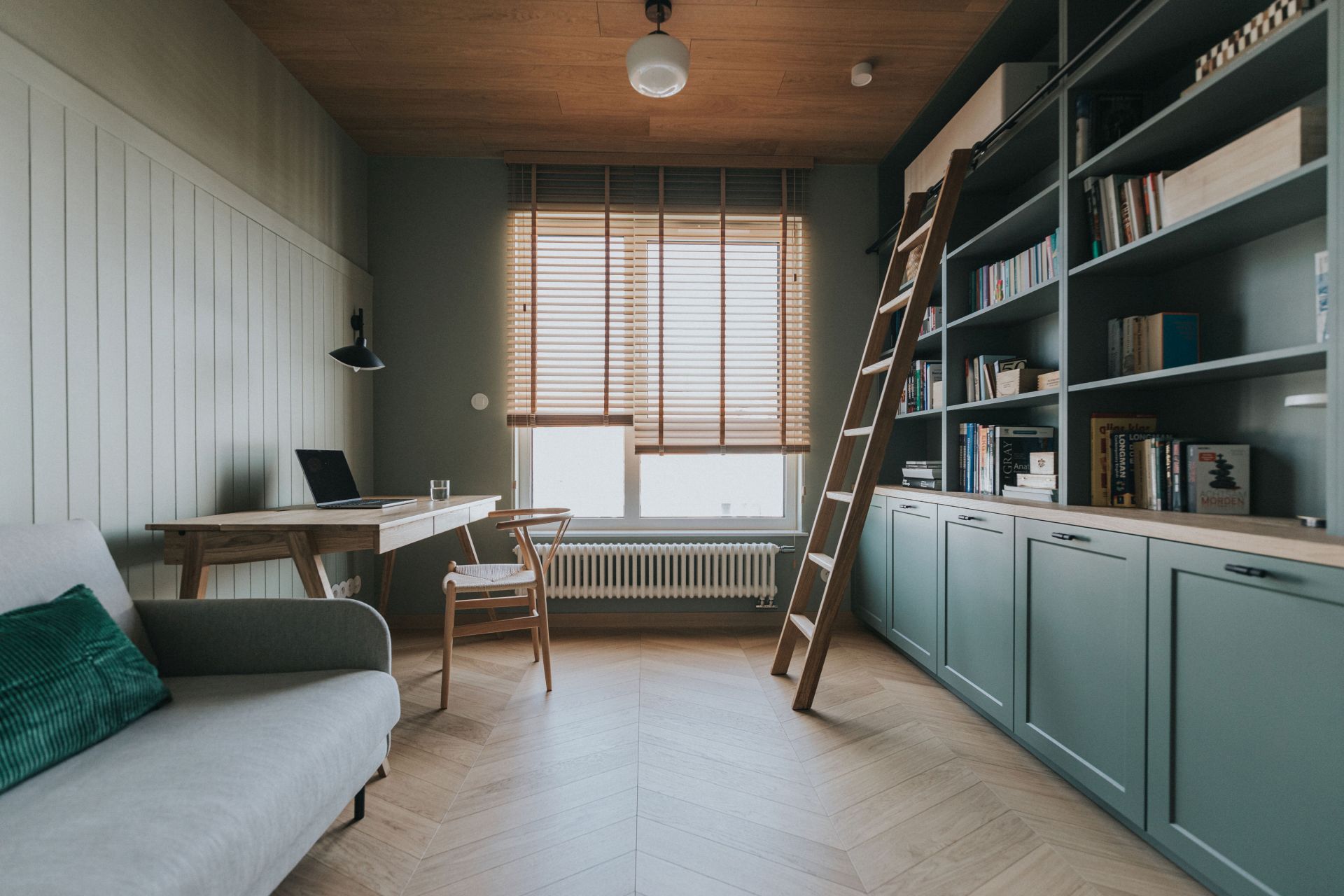 Gabinet i biblioteka to spełnienie marzeń właściciela mieszkania. Drewniane wykończenia pojawiają się tu zarówno na suficie – którego montaż stanowił spore wyzwanie – jak i w formie boazerii świerkowej malowanej w kolorze ścian. Projekt regału umożliwił ukrycie jednostki klimatyzacji przy zachowaniu jej pełnej funkcjonalności.