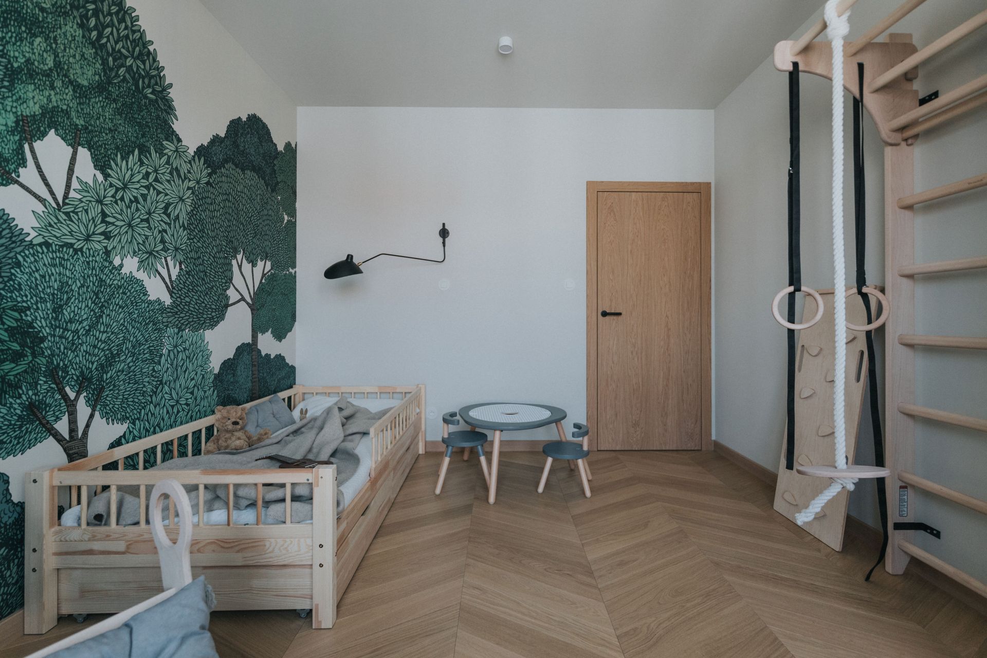 W pokoju dziecięcym uwagę zwraca grafika Maison Wallcoverings, powstała w południowej Afryce i inspirowana lokalną naturą.