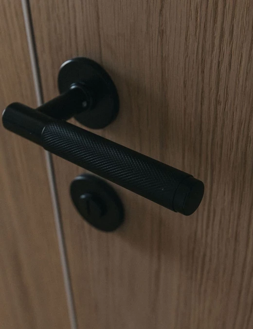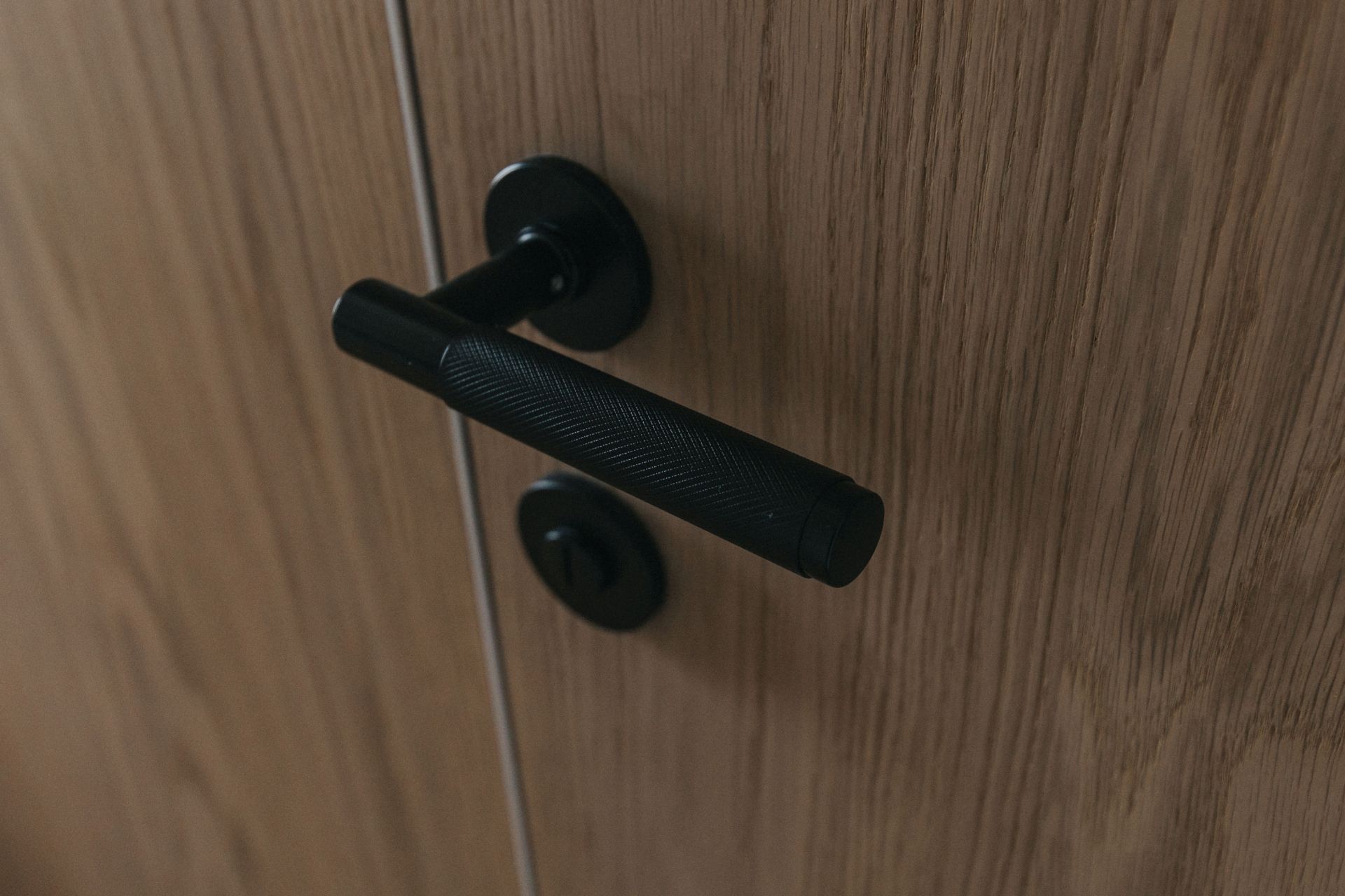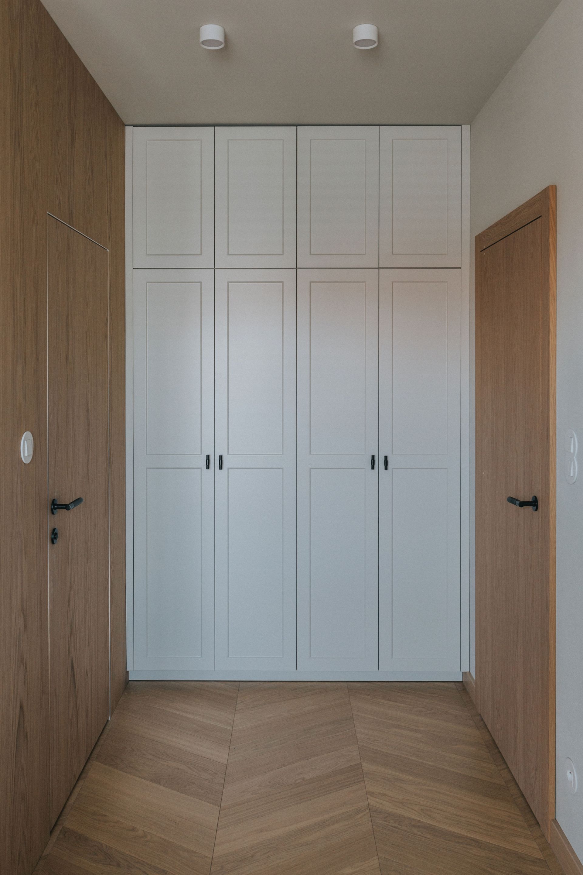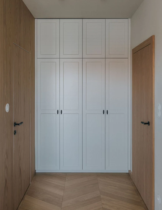 W strefie wejściowej wykonano zabudowę zaprojektowaną z myślą o wizualnej harmonii i porządku. Zastosowano też drzwi polskiej marki MORIC, zlicowane ze ścianą w fornirze dębowym, które niemal całkowicie wtapiają się w drewnianą okładzinę. Dzięki ukrytej ościeżnicy granica między ścianą a skrzydłem drzwi staje się ledwie zauważalna. To rozwiązanie chętnie stosowane przez MORIC, markę znaną z perfekcyjnego wykończenia i dbałości o detale stolarskie.