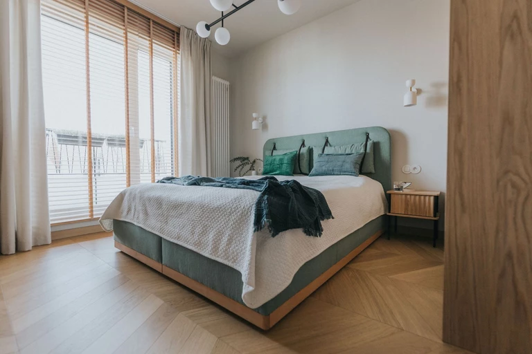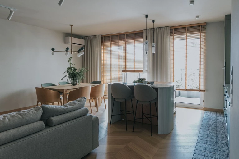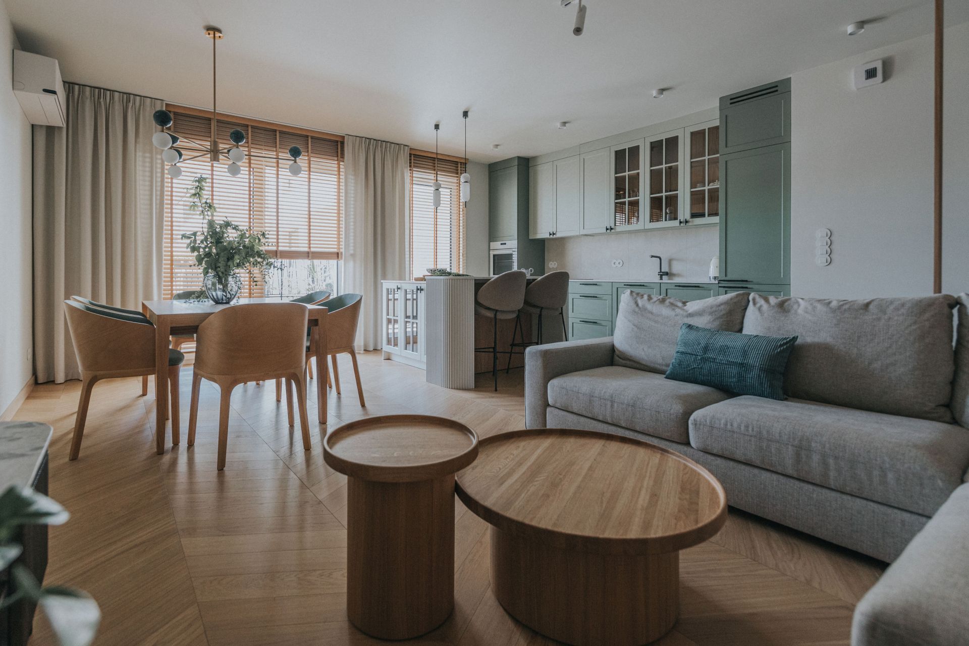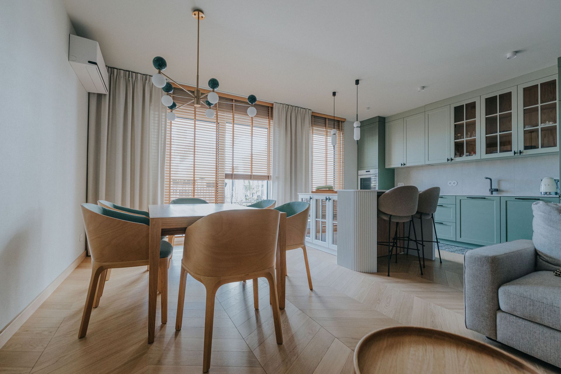 Motywem przewodnim wnętrza stała się zieleń – kolor, który pojawia się między innymi na ścianach pokrytych strukturalnym tynkiem. Zrezygnowano z części ścianek działowych, co pozwoliło połączyć salon z kuchnią i jadalnią. Dzięki tej decyzji południowe światło swobodnie przenika przez przestrzeń, a modelują je szerokie żaluzje oraz ażurowa ścianka.