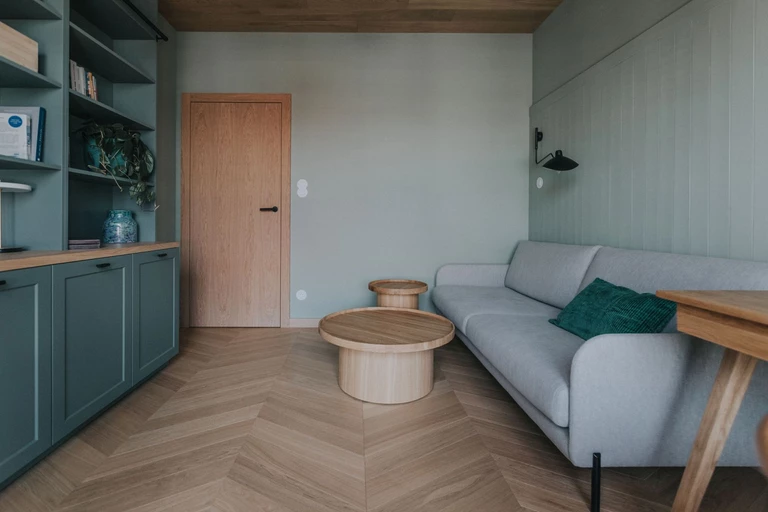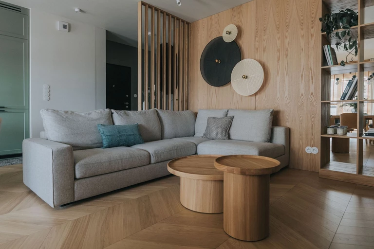 W mieszkaniu pojawia się naturalne drewno: dębowe forniry w piaskowym odcieniu pokrywają ściany i stanowią elementy zabudowy. Podłogę wykonano ze szczotkowanego, fazowanego parkietu ułożonego w jodełkę węgierską.