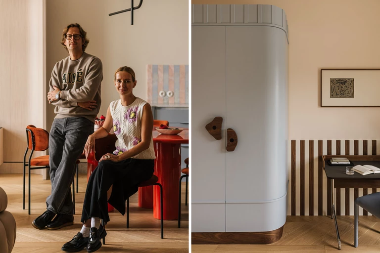 W kuchni i jadalni królują kolory ziemi, które zestawiono z pastelowymi odcieniami. Kuchenne meble, w całości wykonane z drewna, pomalowano subtelnym odcieniem błękitu. Blaty wykończono dwoma rodzajami marmuru – w tonacjach błękitu oraz delikatnego różu. Z kolei centralnym punktem jadalni jest pomarańczowy stół, lakierowany na wysoki połysk, za którego projekt odpowiada zespół JT GRUPA. Do mebla dobrano tapicerowane krzesła marki GUBI oraz modernistyczny żyrandol.