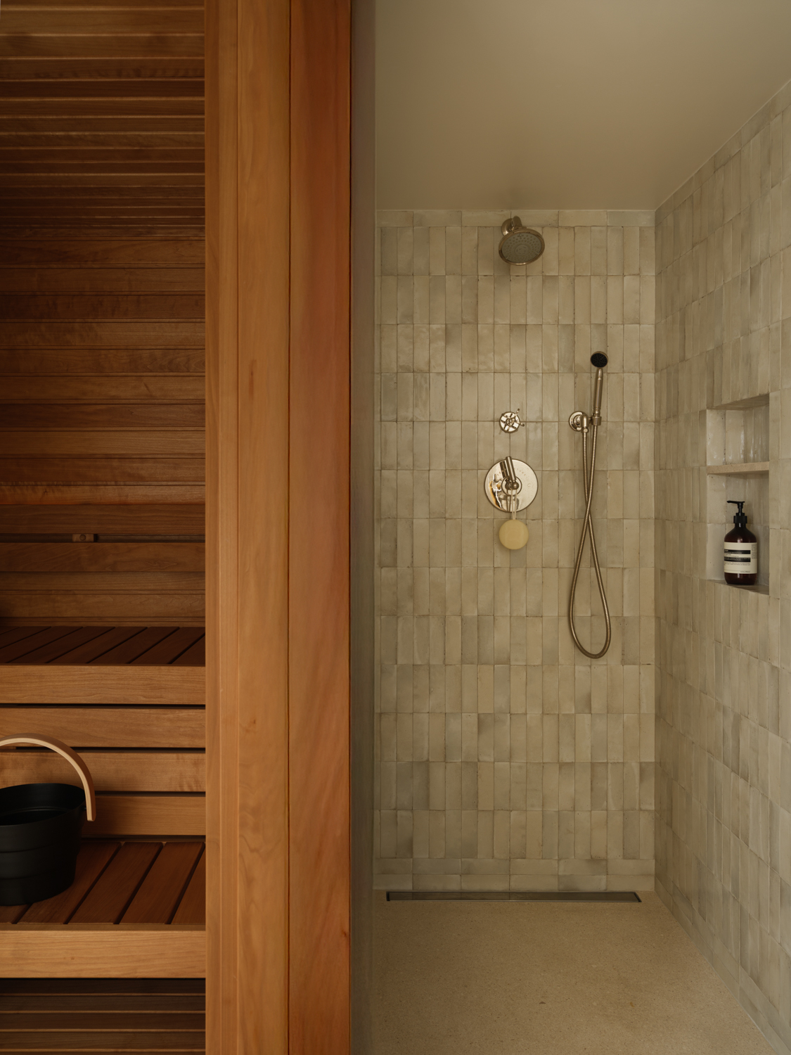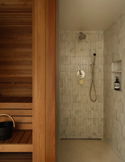 Prywatna strefa na piętrze jest cicha i intymna. Każda z łazienek została potraktowana jak osobne doświadczenie, z indywidualnym doborem materiałów, światła oraz mebli. Większa z łazienek dla gości mieści saunę z gorącymi kamieniami, która nawiązuje do podejścia wellness – zarówno poprzez materiały, jak i organizację przestrzeni.