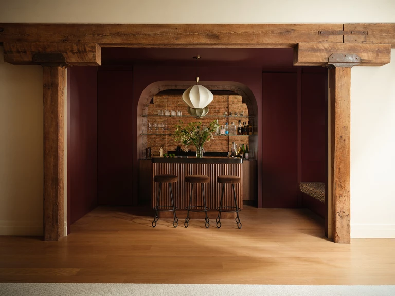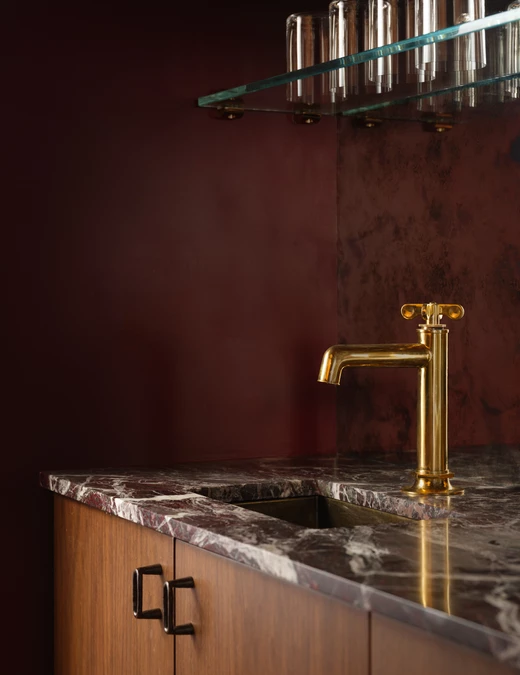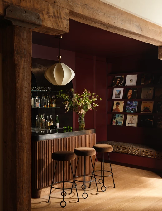 Tuż za kuchnią kryje się bar, który za dnia pozostaje niemal niewidoczny, by wieczorem zaskoczyć teatralnością. Nastrojowe światło, bogate materiały i ciemniejsza paleta barw tworzą przestrzeń o wyraźnym charakterze.