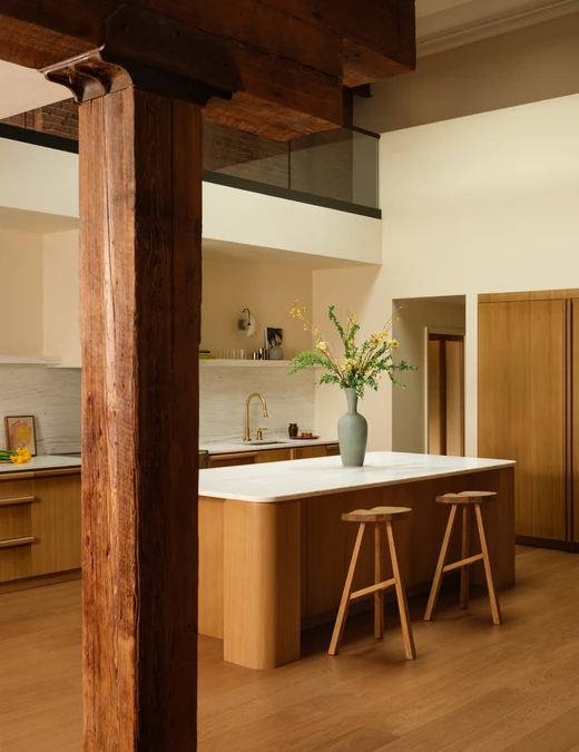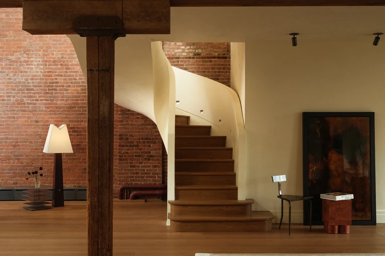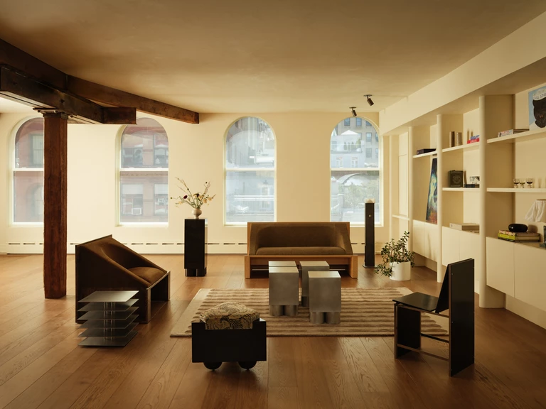 Mieszkanie jest jednym z pięciu apartamentów, które mieszczą się w tym kameralnym, sześciopiętrowym budynku w Tribece w Nowym Jorku. Projektantki z MA Studio przez dwa lata pracowały nad reinterpretacją tej przestrzeni, jednocześnie zachowując i podkreślając jej historyczne warstwy: wysokie sufity, oryginalne drewniane belki i duży świetlik, które podkreślają imponującą skalę wnętrza. Odpowiedzią na tę monumentalność było świadome zmiękczenie industrialnych elementów poprzez fakturę, rytm i ciepłe materiały.
