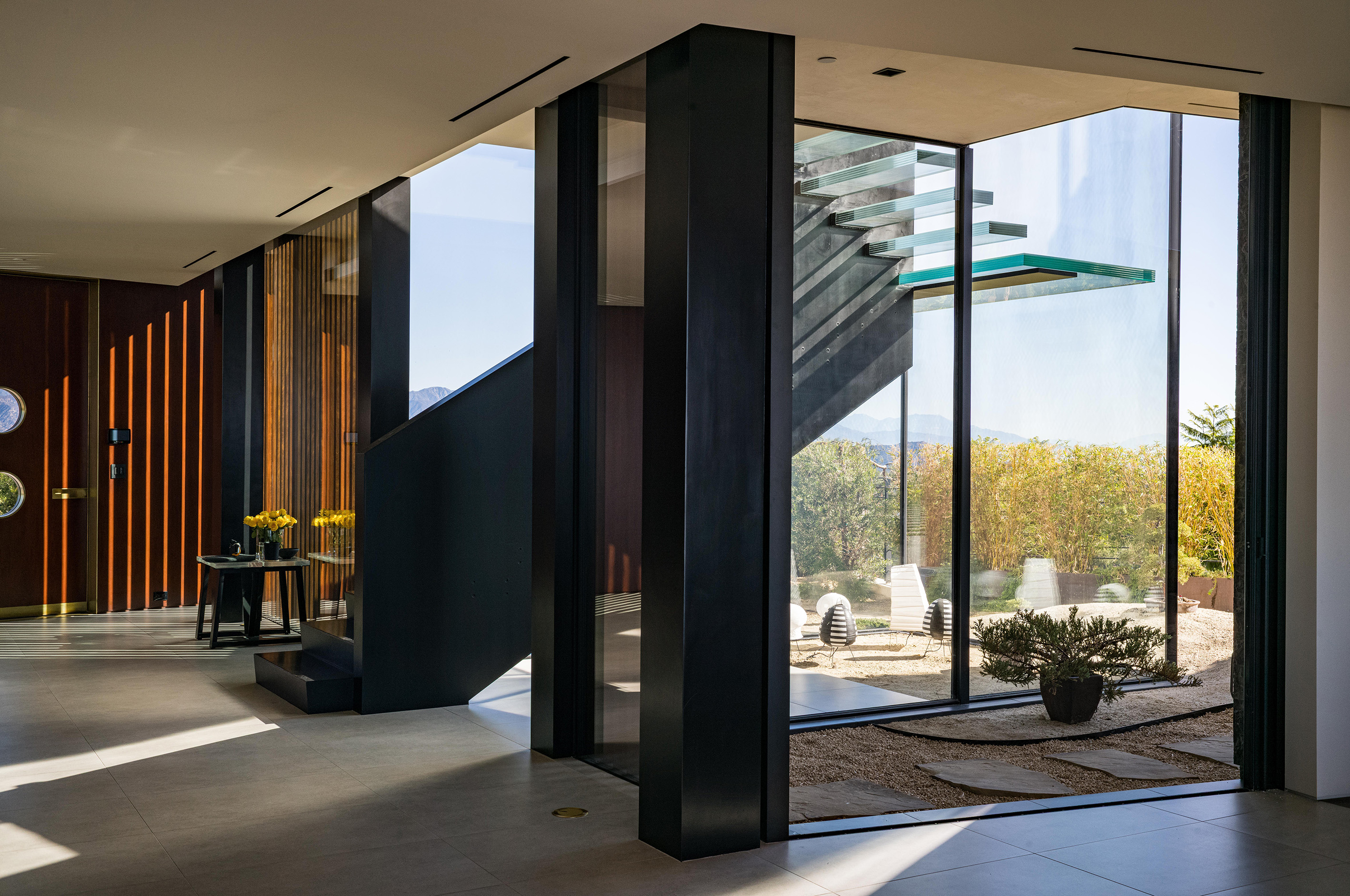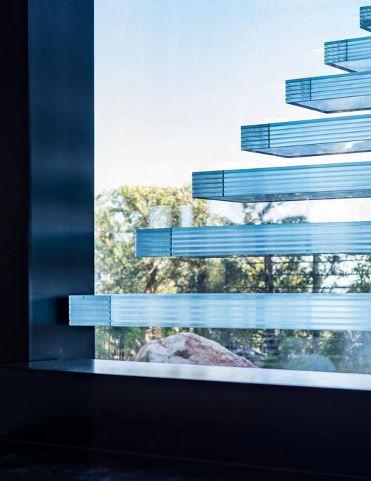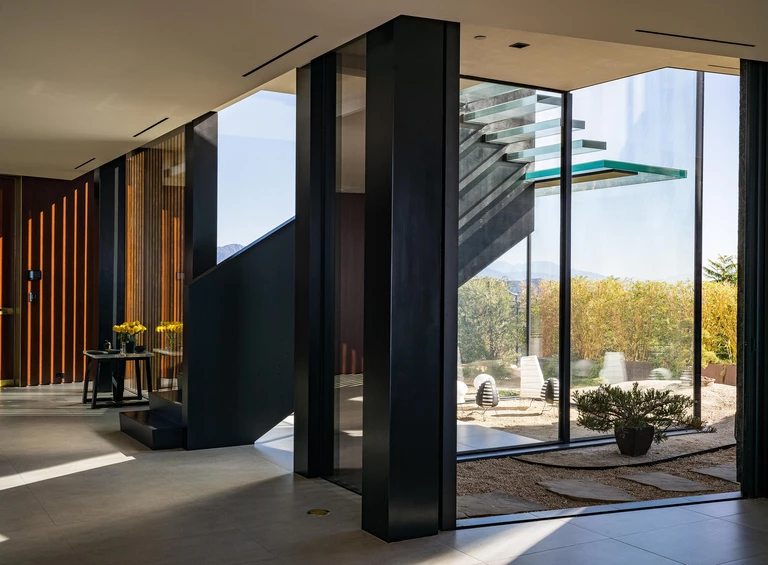 Rozległe szklane powierzchnie zacierają granice między wnętrzem a zewnętrzem, pozwalając domowi oddychać w rytmie krajobrazu. Okna sięgające od podłogi do sufitu i panele przesuwne oferują niezakłócone widoki na zieleń, zalewając wnętrza naturalnym światłem.