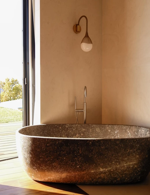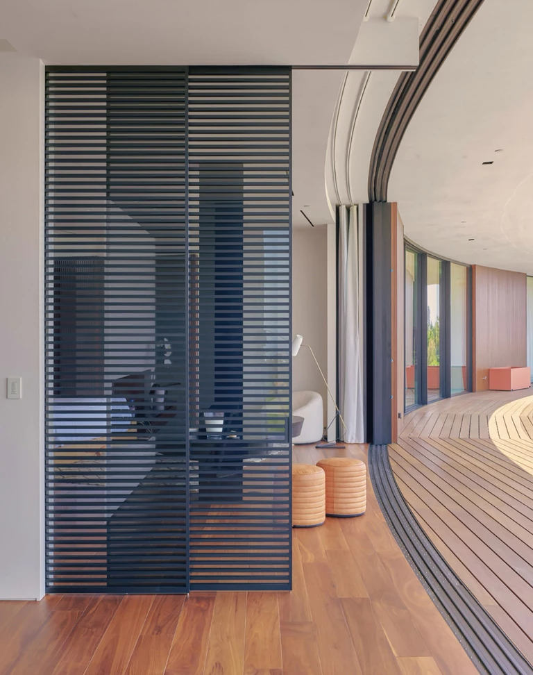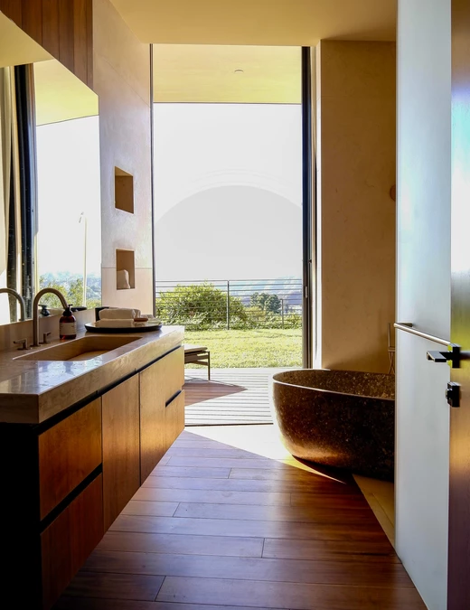 Materialność odgrywa kluczową rolę w zakotwiczeniu rezydencji w jej lokalizacji. Staranny dobór drewna, naturalnego kamienia i szkła tworzy dotykowy dialog między strukturą a krajobrazem. Materiały te, wybrane ze względu na ich wizualną harmonię z otoczeniem, a także trwałość i zrównoważony charakter, przyczyniają się do tworzenia architektury, która jest zarówno wyrafinowana, jak i odpowiedzialna. Wykończenia są celowo subtelne, podkreślając kunszt i dbałość o detale.