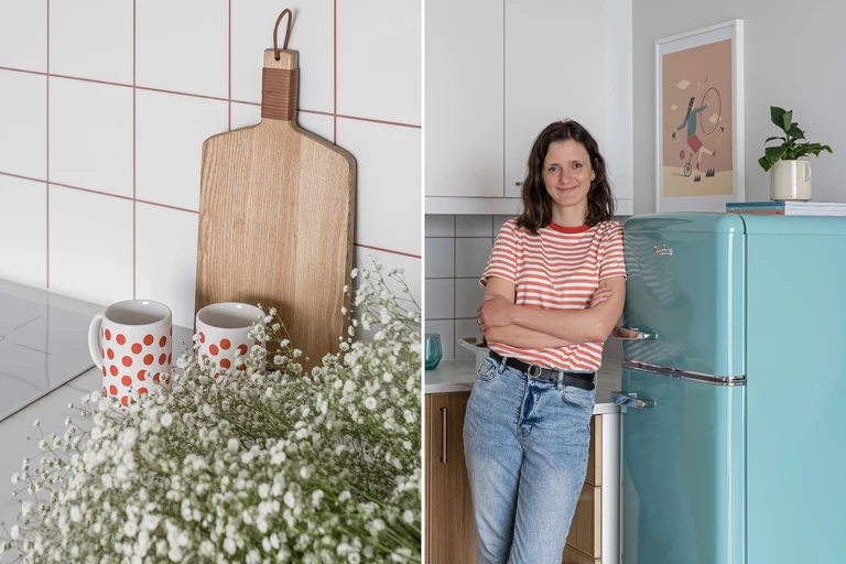 W mieszkaniu znajduje się salon z aneksem kuchennym o powierzchni ok 17m². Ciekawym elementem dekoracyjnym w tym pomieszczeniu jest koło z płyty MDF wiszące na ścianie lakierowane w odcieniu turkusu (NCS dobrany z odcienia lodówki firmy Amica). Ten sam kolor pojawia się również w sypialni. Koło stanowi dodatkową oprawę dla stylowego kinkietu trójmiejskiej marki Ummo. Stonowaną kolorystykę kuchni z fornirowanymi, dębowymi oraz białymi frontami a także marmurowym blatem ożywia turkusowa lodówka. Pojawia się również idealnie współgrająca kolorystycznie grafika Martyny Wójcik-Śmierskiej. Klasyczne płytki ułożone nad blatem nabrały wyrazu dzięki fudze w kolorze ceglanej czerwieni.