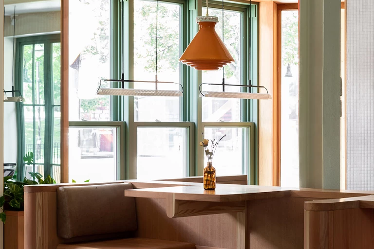 Otwarta, wypełniona światłem kawiarnia oferuje wspaniały widok na Morgan Park. Gości wita monolityczny bar z lastryko udekorowany rzędem kraników do wina. Niestandardowe oprawy oświetleniowe, zaprojektowane we współpracy z Lambert & Fils, kontrastują z industrialnymi lampami wiszącymi, a wykonane na zamówienie meble współgrają ze stołami i krzesłami w stylu vintage.
