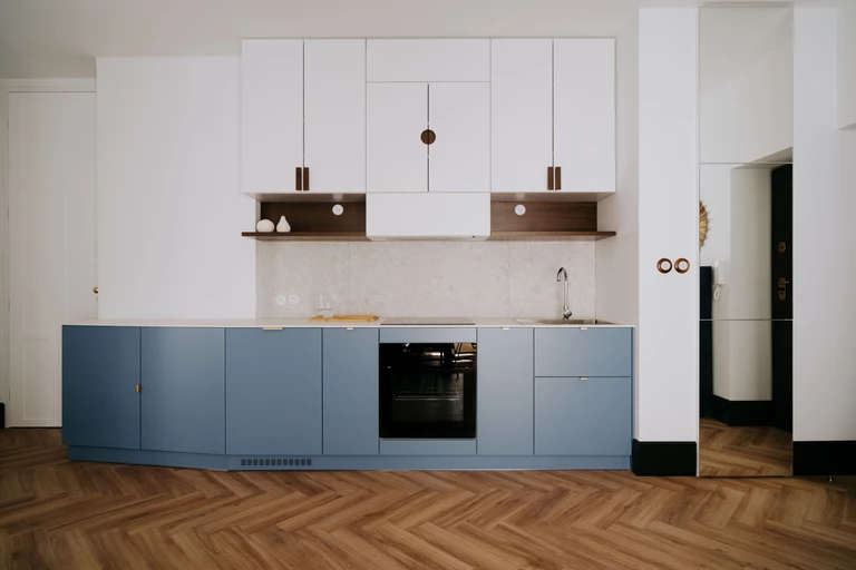 Ważnym punktem jest kuchnia, gdzie symetria oraz asymetria wzajemnie się ze sobą komponują, tworząc klasyczne wzory, przeciągnięte w ścięte, bardziej nowoczesne formy. Uzupełnieniem jest świeży kolor błękitu – pierwsza z barw, tworząca rytm mieszkania, a także detale cięte z orzechowego drewna, zaklęte w okręgi i łuki.