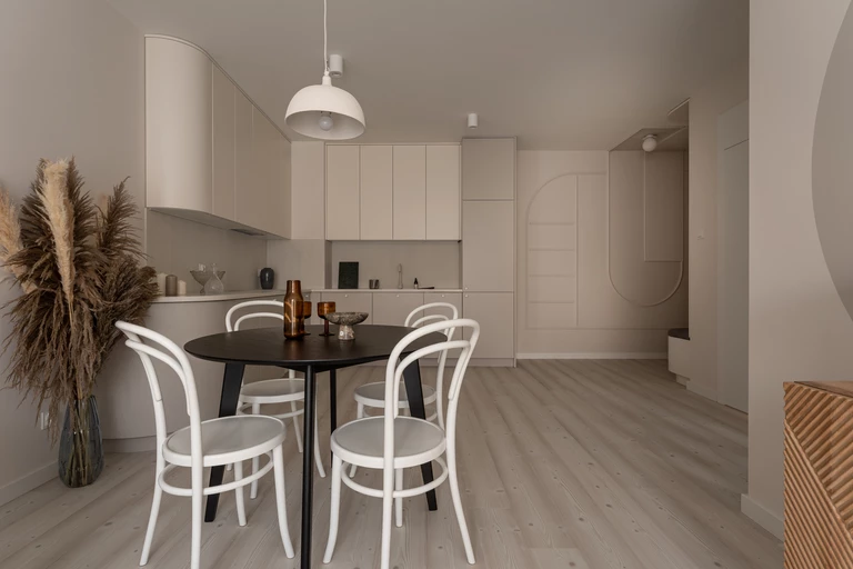 W holu mieszkania zagospodarowano miejsce na dużą szafę z siedziskiem, w której ukryta jest pralka. Pomimo niewielkich rozmiarów przestrzeni dziennej, kuchnia wykonana na wymiar mieści wszystkie niezbędne sprzęty i sporą liczbę szafek. Poprzez zaoblenie szafki zabudowa wkomponowuje się w przestrzeń zamiast ją zakłócać.