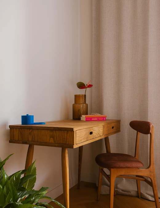 Wnętrze to jednak nie tylko „baza”, ale przede wszystkim wypełniające ją obiekty. W centrum kuchni stanął stół otoczony prawdziwymi perełkami polskiego designu – odrestaurowanymi krzesłami projektu profesora Rajmunda Hałasa. Obecność tych klasyków świetnie koresponduje z duńskimi inspiracjami, które były punktem wyjścia dla wielu rozwiązań w tym mieszkaniu.