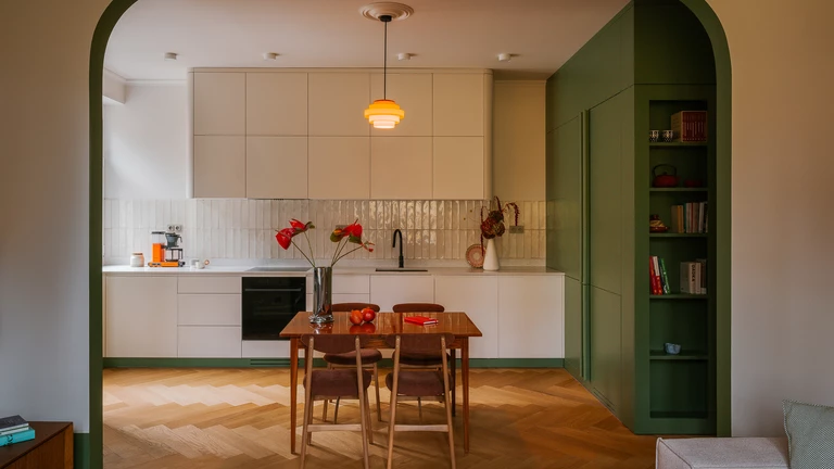 Pierwsze skrzypce w strefie dziennej gra kolor. Architekt zdecydował się na odważną, wyrazistą zieleń zabudowy meblowej, która stanowi mocny kontrapunkt dla jasnych, minimalistycznych frontów kuchennych. To zestawienie wprowadza do wnętrza energię, ale nie przytłacza. Bazą dla tych barwnych eksperymentów jest podłoga ułożona w klasyczną jodełkę – czytelny ukłon w stronę tradycji lokalnej architektury i szacunek dla rodowodu budynku.