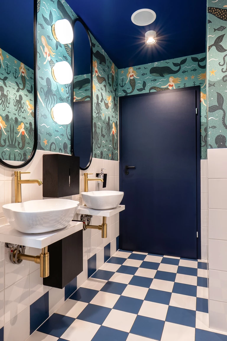 Nawet łazienka ma tu swoją historię. W Syrence kąpią się syreny – dosłownie i w przenośni. To nie tylko funkcjonalne pomieszczenie, ale scenografia, która współtworzy nastrój całej restauracji. Granat, zieleń, złoto, subtelny połysk i odbicia w lustrze tworzą teatralny klimat. Idealna przestrzeń, by zatrzymać chwilę – i zrobić selfie.