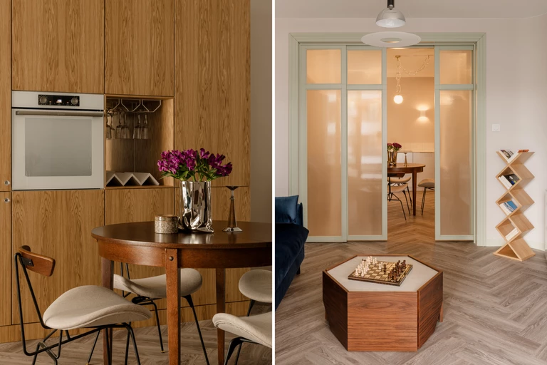 Strefa dzienna mieszkania składa się z dwóch części, które oddzielają przesuwne drzwi z szałwiową ościeżnicą, wypełnione szklanym ornamentem. Po jednej stronie znajduje się część kuchenna, której prosty kształt świetnie współgra z okrągłym, starym stołem i krzesłami o współczesnym kształcie. „Kuchnia i jadalnia to przeplot niskich i wysokich form zabudów zamkniętych w mniejsze pudełka, których każdy detal został przez nas wypracowany” – opisują projektanci.