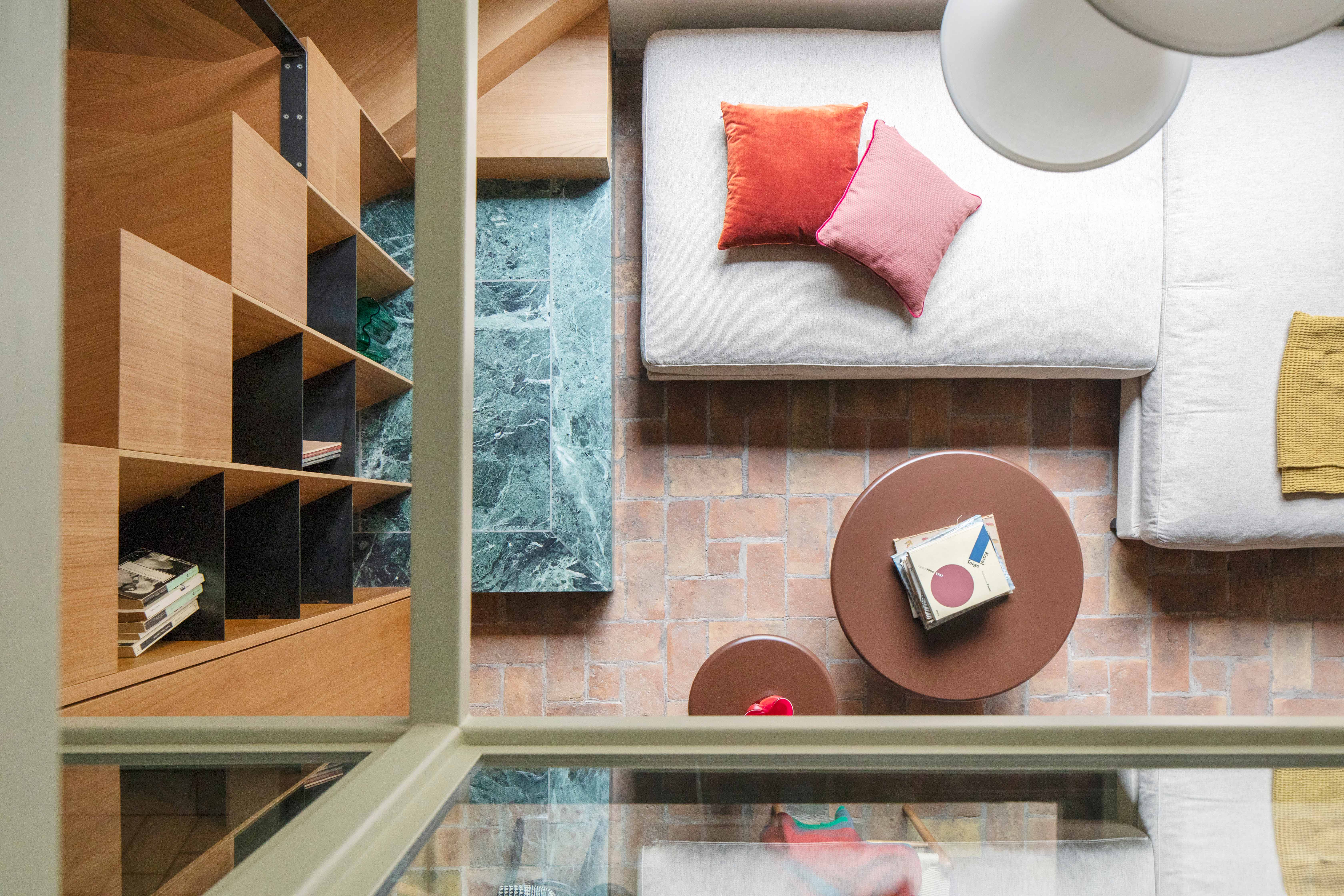 Kolejna klatka schodowa – z surowego żelaza i stopni z drewna wiśniowego – prowadzi z sypialni na najwyższy poziom, gdzie mieści się niewielka pracownia.