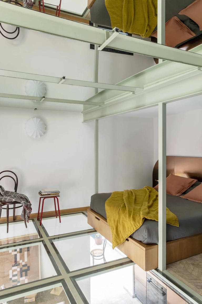 Ten sam intensywny kolor prowadzi wzrok ku górze, przenikając przez antresolę. Aby wpuścić więcej światła, część antresoli została otwarta, co nadało jej wrażenie przestrzennej lekkości. Szklane panele w podłodze i lustra potęgują wrażenie głębi.