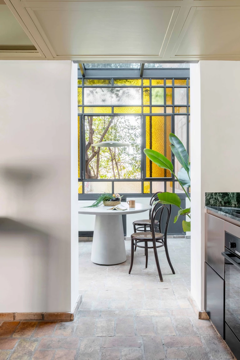 Dom ma zaledwie 80 m², rozłożonych na trzech kompaktowych poziomach, które wieńczy taras tonący w zieleni. Prace projektowe rozpoczęto od odnowienia najbardziej charakterystycznych elementów – przede wszystkim frontowej werandy z witrażami w odcieniach zieleni, różu i żółci.