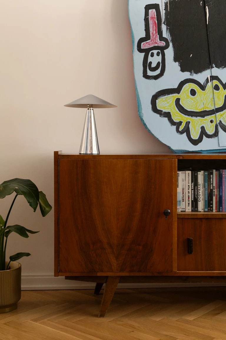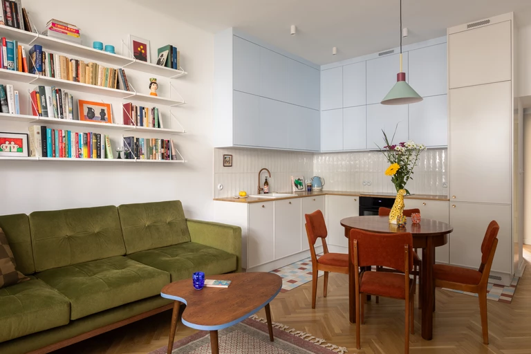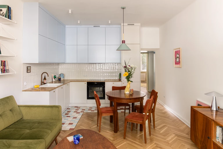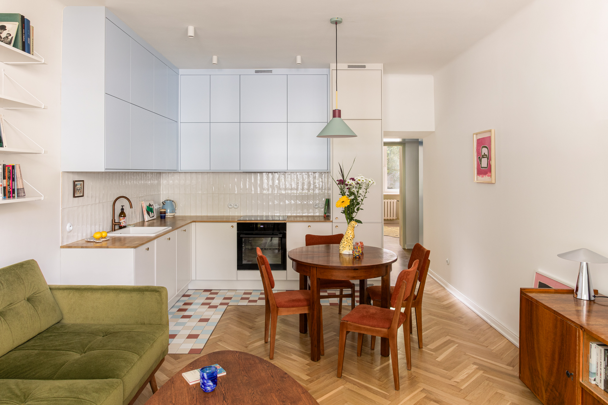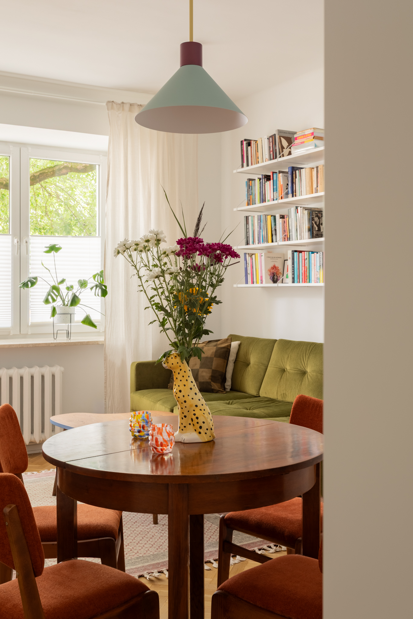 Salon płynnie przechodzi w otwartą kuchnię, tworząc harmonijną strefę codzienności, w której granice między relaksem a pracą kuchenną naturalnie się zacierają. W centrum stanął odrestaurowany okrągły stół Art Deco z lat 40., zestawiony z krzesłami Motylkami Rajmunda Hałasa – ikonicznym projektem z lat 60., który zyskał nową energię dzięki pomarańczowej, welurowej tapicerce. Organiczna forma krzeseł, z siedziskiem i oparciem przypominającym skrzydła motyla, opowiada historię polskiego wzornictwa. Całość dopełnia pastelowa lampa duńskiej marki Hübsch o klasycznej trapezowej formie w stylu vintage.