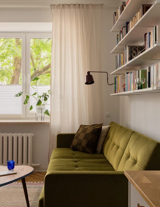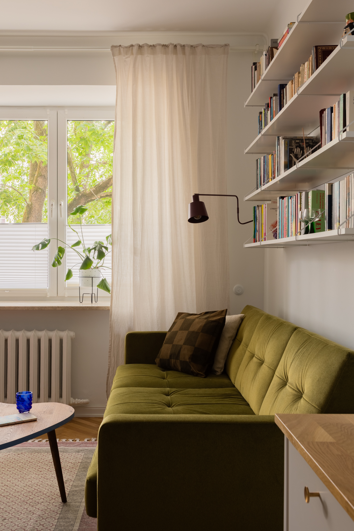 Do strefy relaksu zaprasza miękka sofa w stylu wersalki, pokryta ciepłym, oliwkowym welurem – kolejne nawiązanie do retro estetyki. Nad sofą zawisły lekkie, funkcjonalne półki mieszczące pokaźną kolekcję książek i drobiazgów.