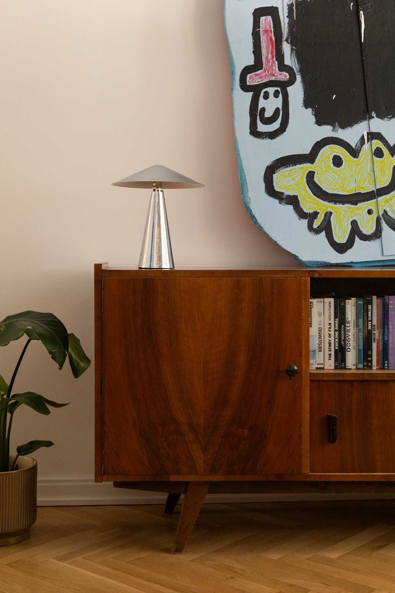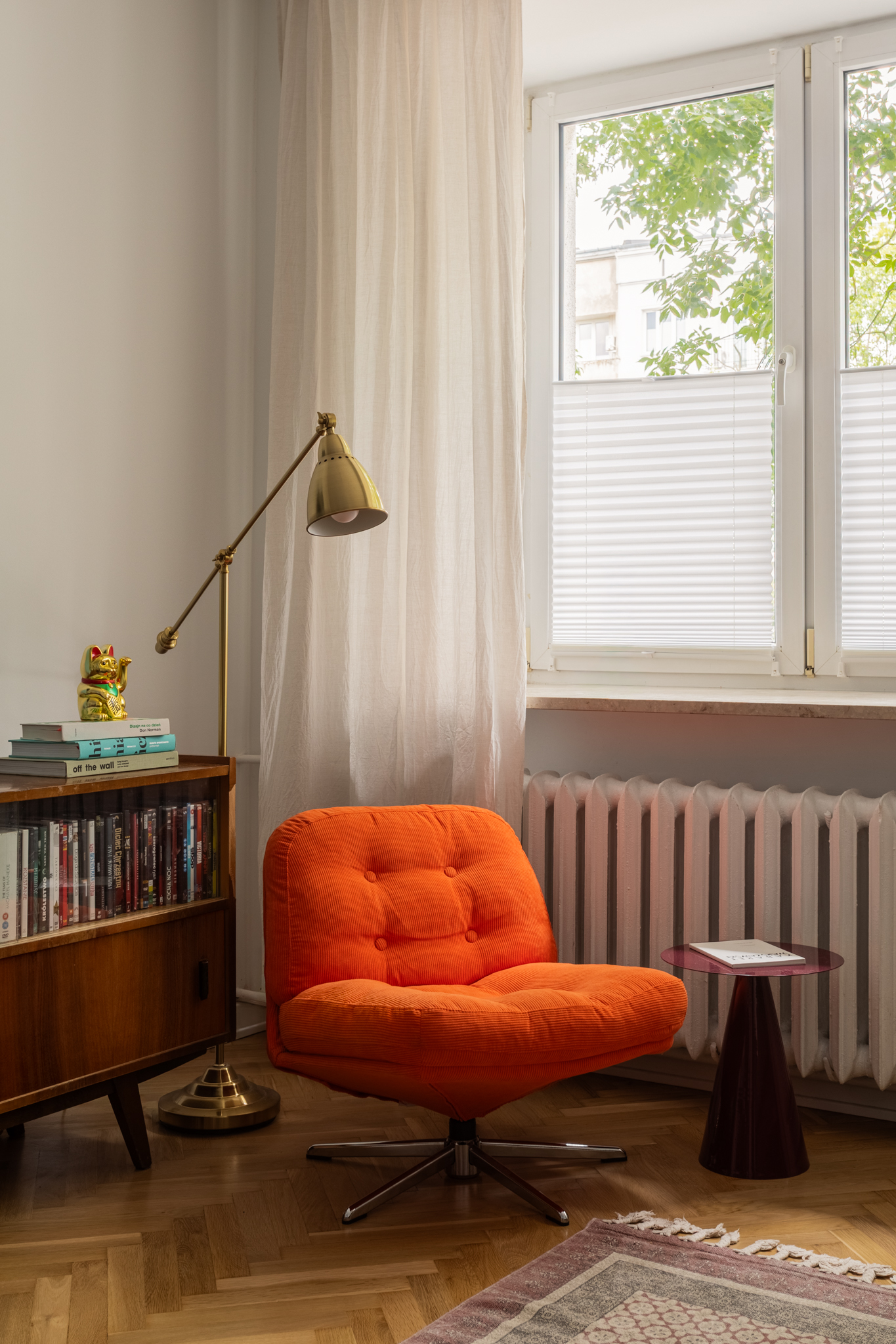 Aranżację uzupełnia fotel obrotowy z chromowaną podstawą – klasyk w pomarańczowym, sztruksowym pokryciu. Jego dynamiczna forma, inspirowana designem lat 50. i 60., idealnie koresponduje z Motylkami Hałasa.