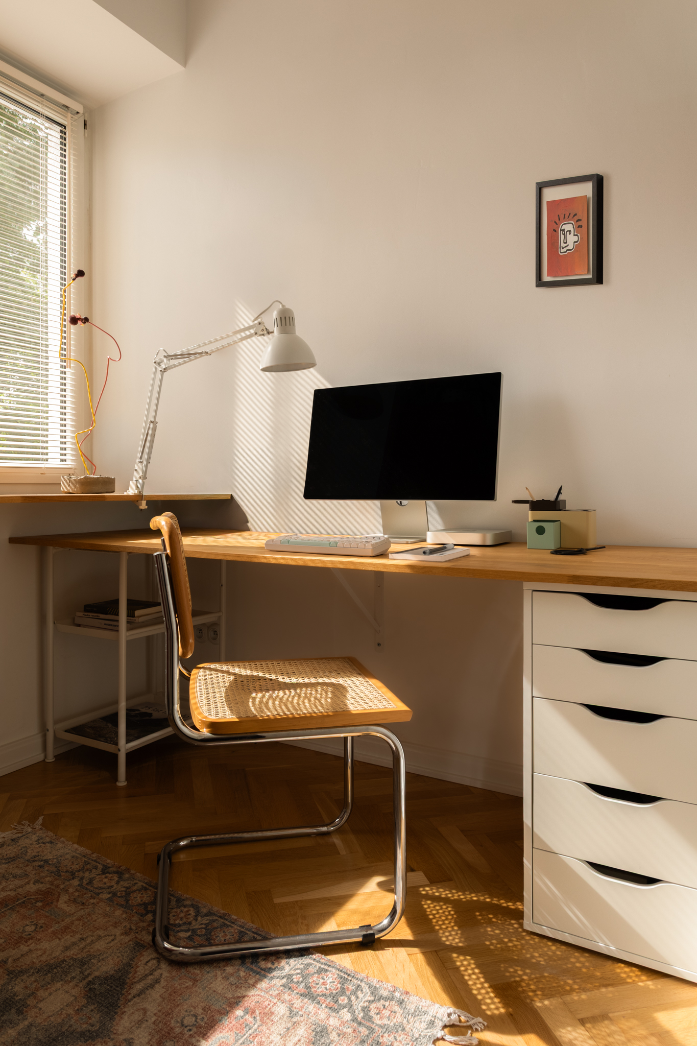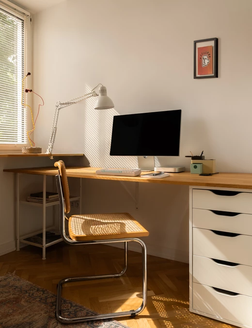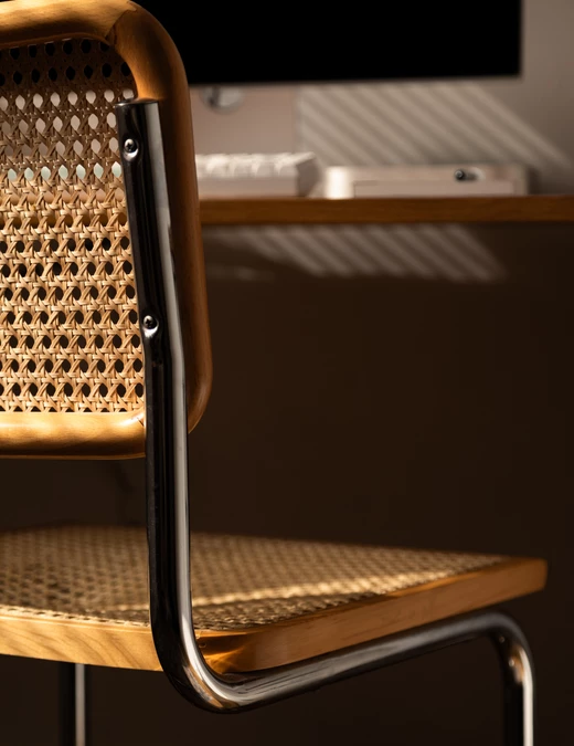 W miejscu dawnej kuchni projektantka wydzieliła przestrzeń do pracy. Gabinet potraktowano z minimalistyczną dyscypliną. Centralnym elementem jest drewniany blat biegnący przez całą długość ściany, oferujący przestronną powierzchnię roboczą. Krzesło Cesca projektu Marcela Breuera, z charakterystyczną tubularną ramą i plecionym siedziskiem, przywołuje bauhausowską precyzję i elegancję. Funkcjonalne oświetlenie zapewnia metalowa lampa na wysięgniku, która w połączeniu z krzesłem tworzy wyrafinowaną i praktyczną aranżację.