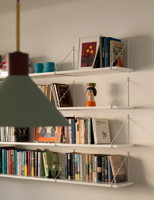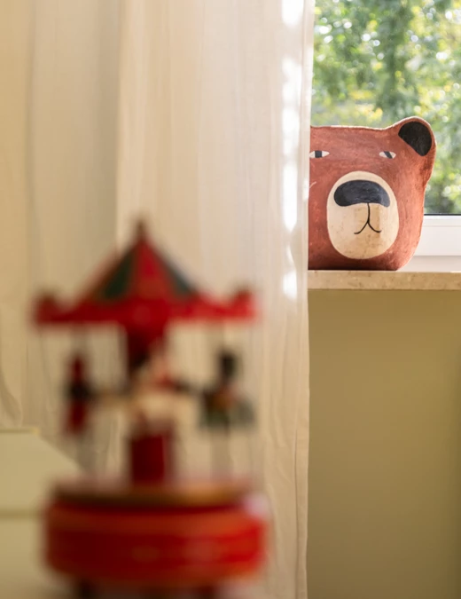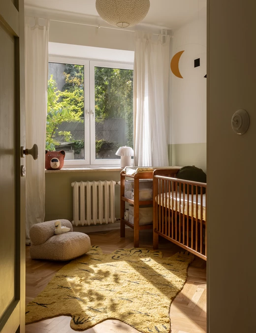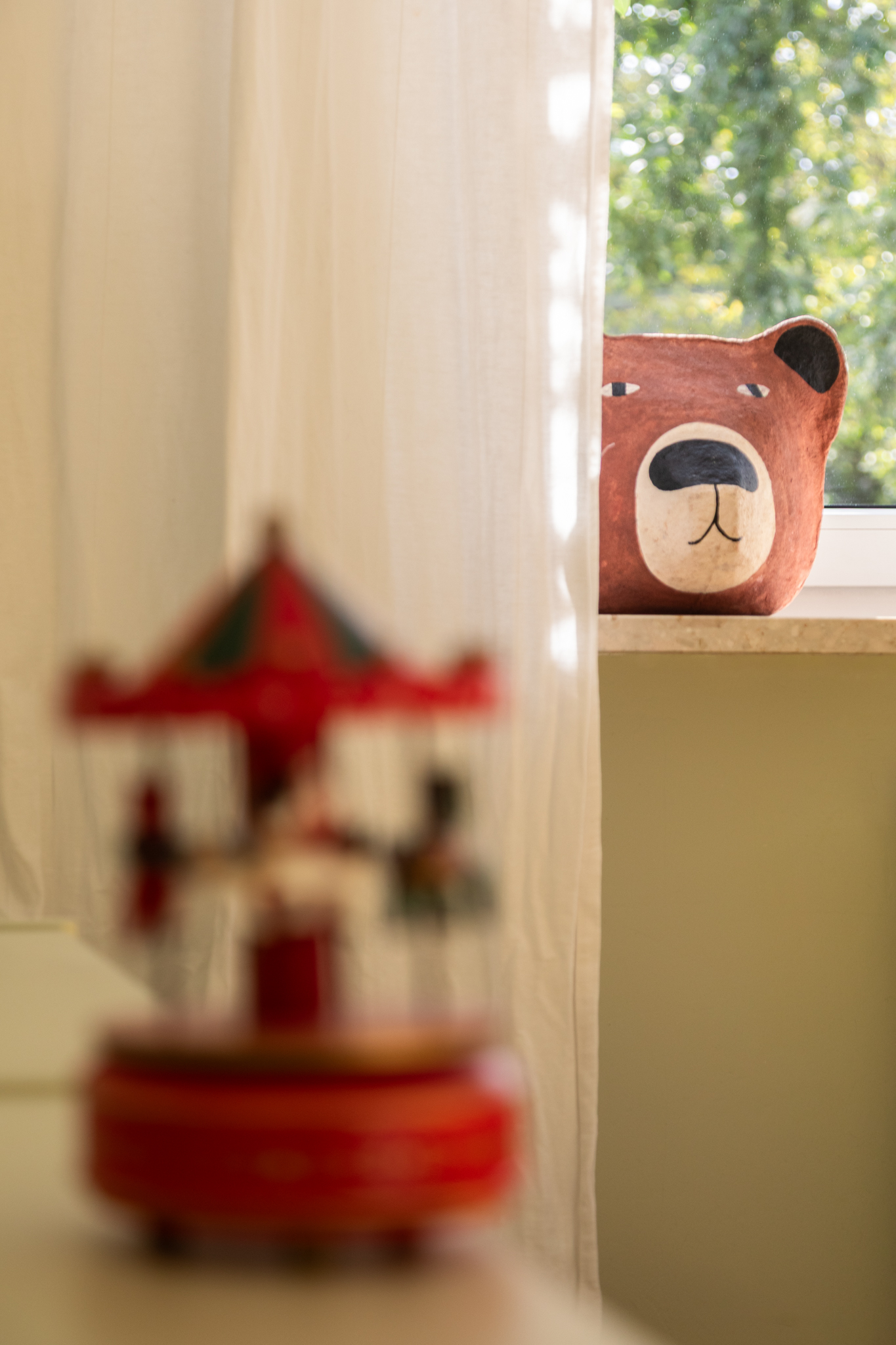 Pokój dziecka utrzymano w duchu prostoty i radości. Jasne tło rozświetlają barwne akcenty: dywan w kształcie tygrysa, maska Miś od Bloomingville oraz mobil inspirowany kinetycznymi rzeźbami Alexandra Caldera. Delikatna, balansująca konstrukcja reaguje na każdy ruch powietrza. Ciepło wnoszą meble marki Woodica – polska produkcja w głębokim orzechowym odcieniu. Całość spaja lamperia w kolorze pistacjowym.
