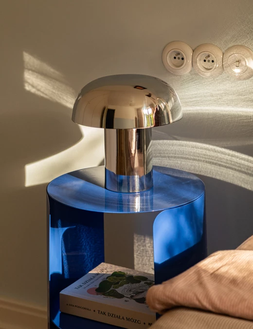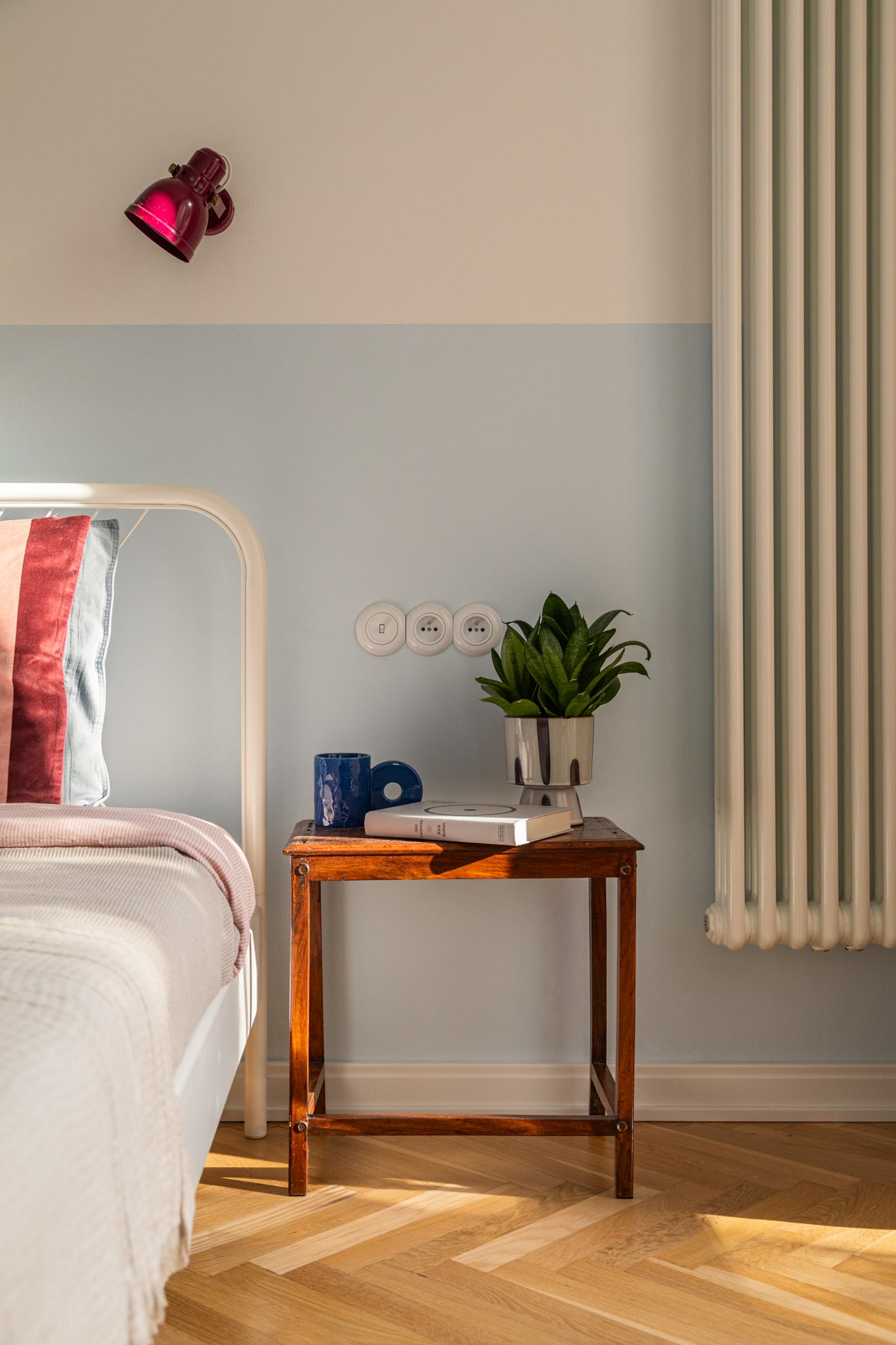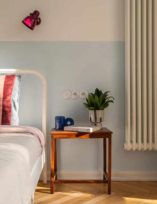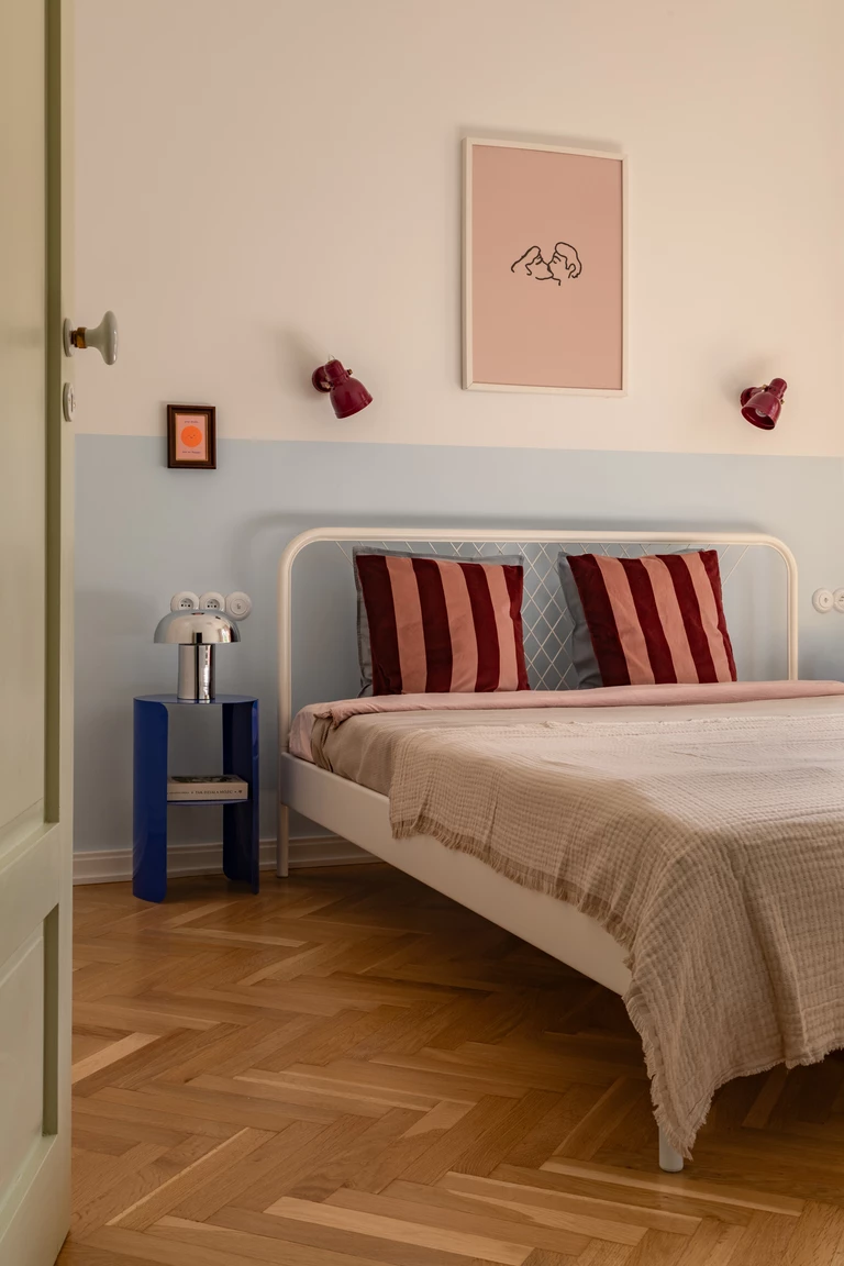 Sypialnia łączy industrialny minimalizm inspirowany skandynawskim funkcjonalizmem z delikatnością koloru. Metalowe łóżko z siatkowym wezgłowiem odbija światło. Błękitna lamperia na ścianie ożywia wnętrze, współgrając z industrialnymi kinkietami od Zangry w soczystym kolorze. Ich surowy design, z widocznymi mosiężnymi śrubami, nawiązuje do fabrycznych lamp z połowy XX wieku.