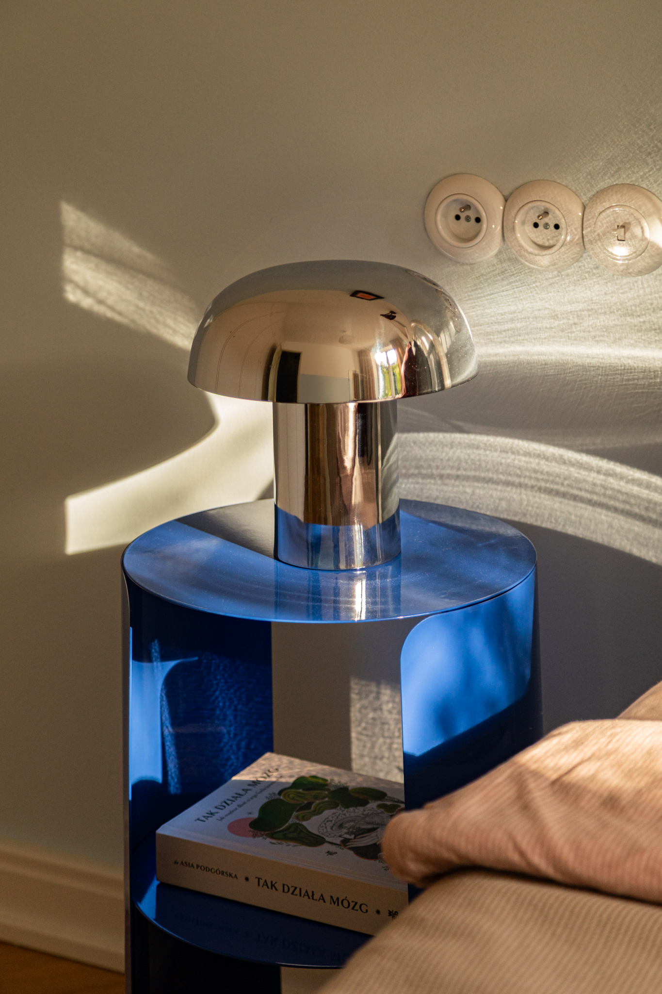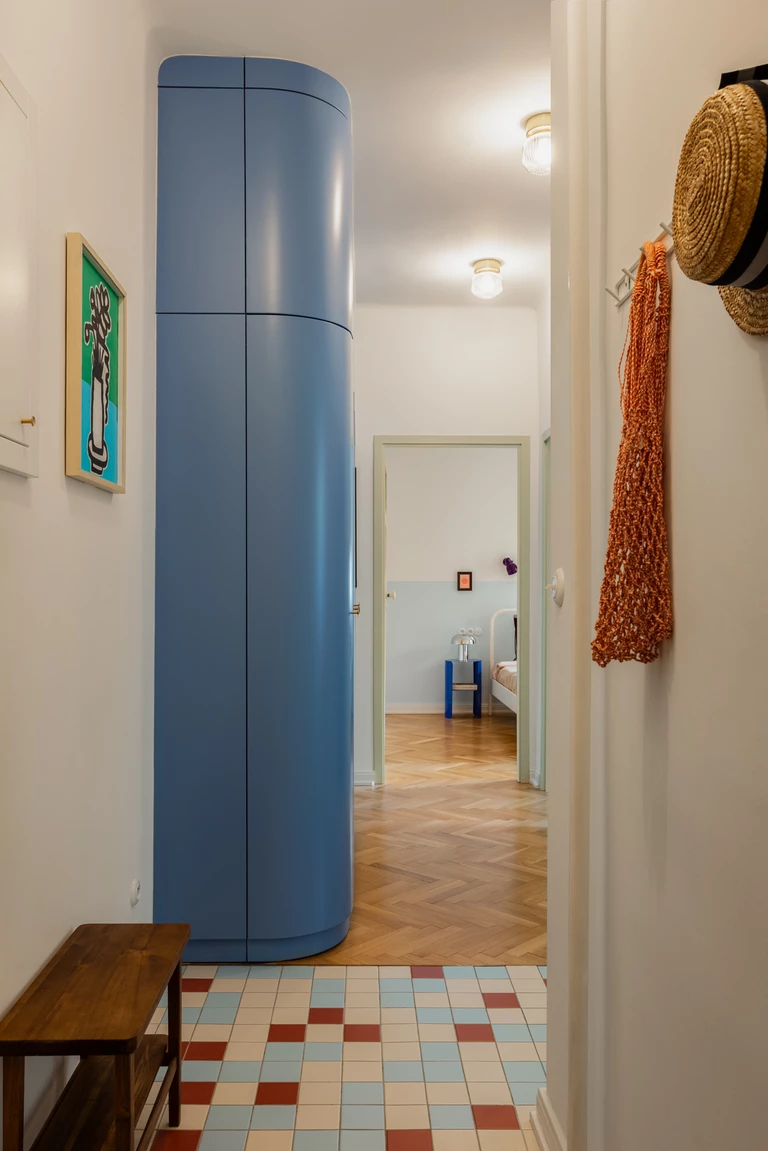 Wąski przedpokój stał się wyzwaniem, które projektantka przekuła w atut. Priorytetem była maksymalizacja przestrzeni i płynność ruchu. Najważniejszym elementem jest tu niebieska szafa na wymiar z zaokrąglonym bokiem, inspirowanym organicznymi formami. Ta miękka linia ułatwia poruszanie się w niewielkiej przestrzeni, jednocześnie nawiązując do ciepłej estetyki modernistycznych mebli.