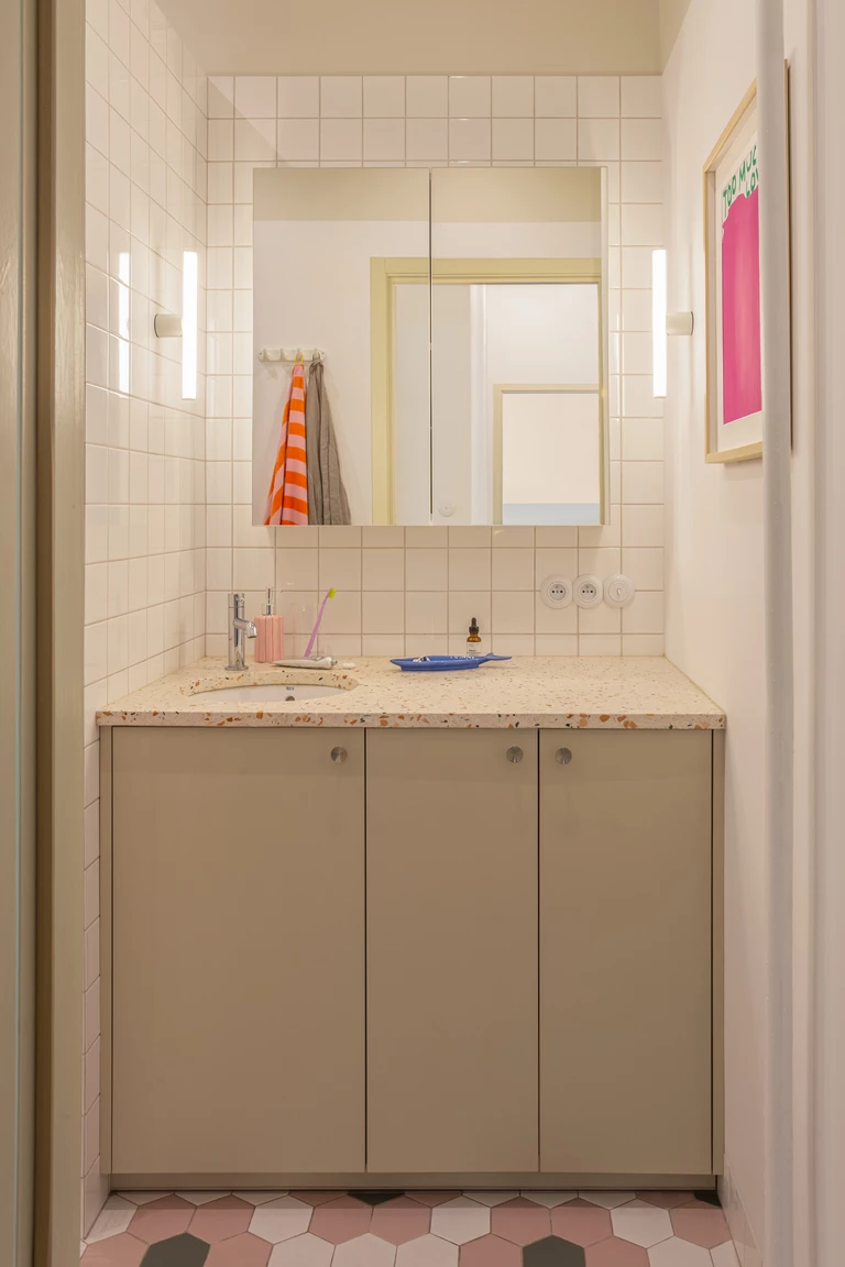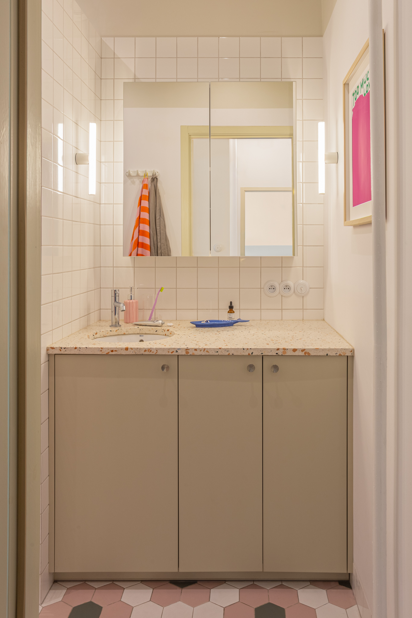 Równomierne, miękkie światło zapewniają kinkiety nawiązujące do high-techowej estetyki lat 80. Ich smukła, techniczna forma kontrastuje z organiczną strukturą lastryko i wzorami płytek. Za pomocą subtelnie dostawionej ścianki wydzielono wnękę prysznicową. Ten zabieg pozwolił zachować otwartość i proporcje wnętrza, jednocześnie zapewniając intymność i funkcjonalność przestrzeni.