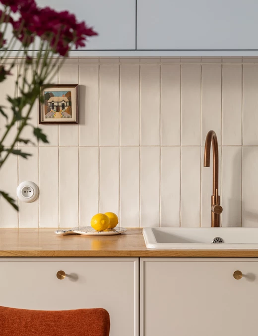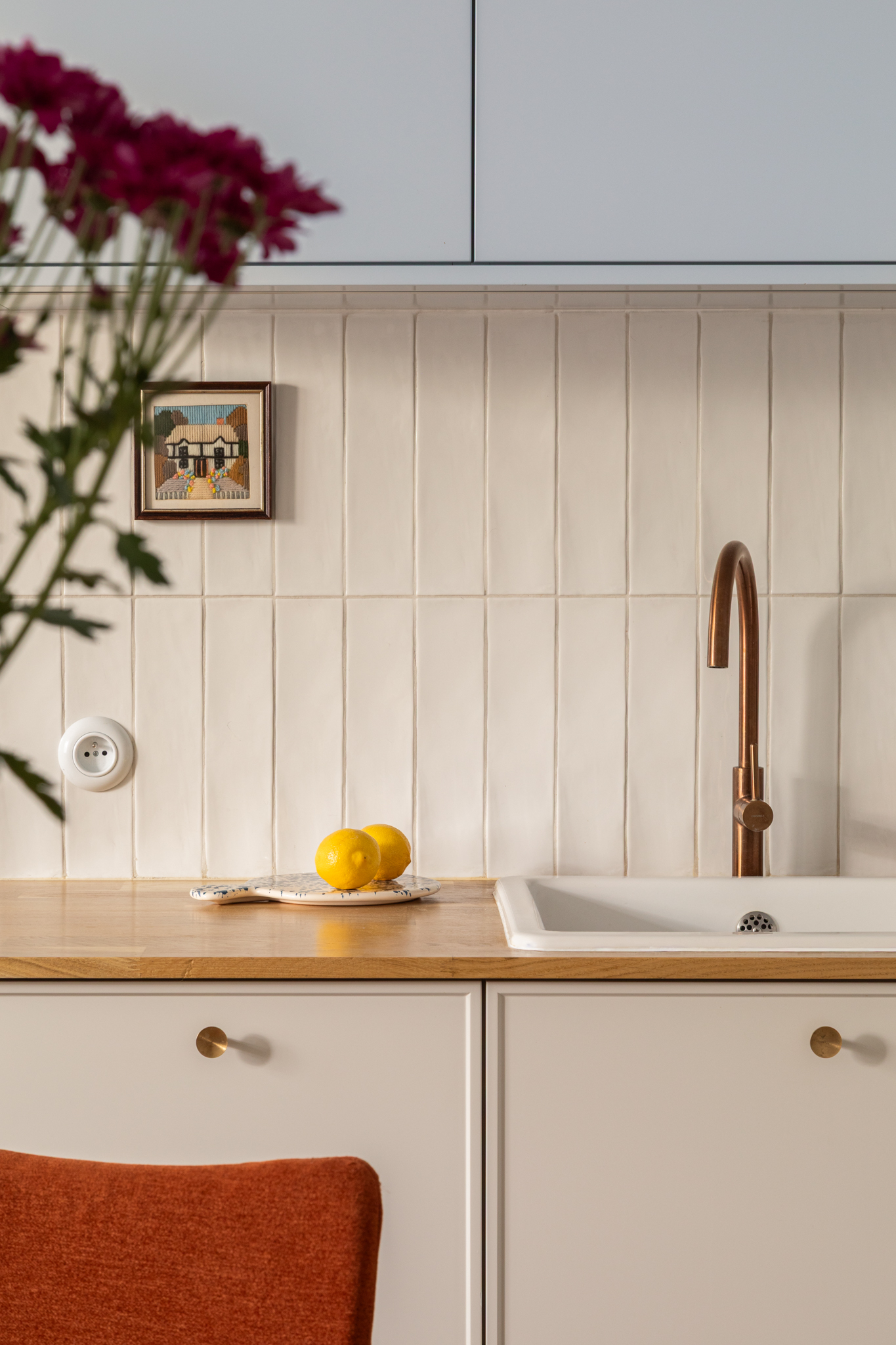 Kuchnia stanowi spokojne tło codziennego życia. Gładkie błękitne fronty górnych szafek, kremowe dolne fronty z frezowaniem oraz dębowy blat tworzą harmonijną kompozycję. Zabudowa sięgająca sufitu pozwala maksymalnie wykorzystać przestrzeń. Szkliwione beżowe płytki o falującej powierzchni oraz dębowy blat łączą rustykalną nostalgię z nowoczesną prostotą. Ceramiczny zlew i miedziana bateria dodają retro akcentu w świeżej, współczesnej odsłonie.