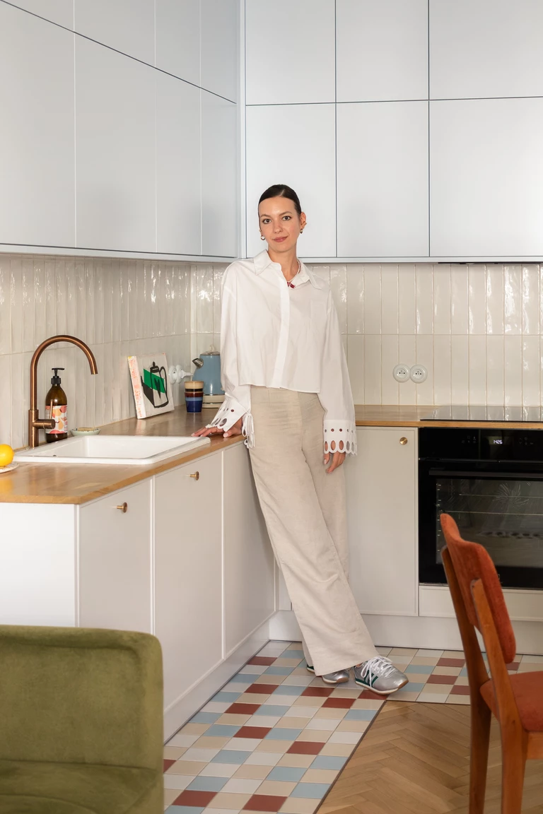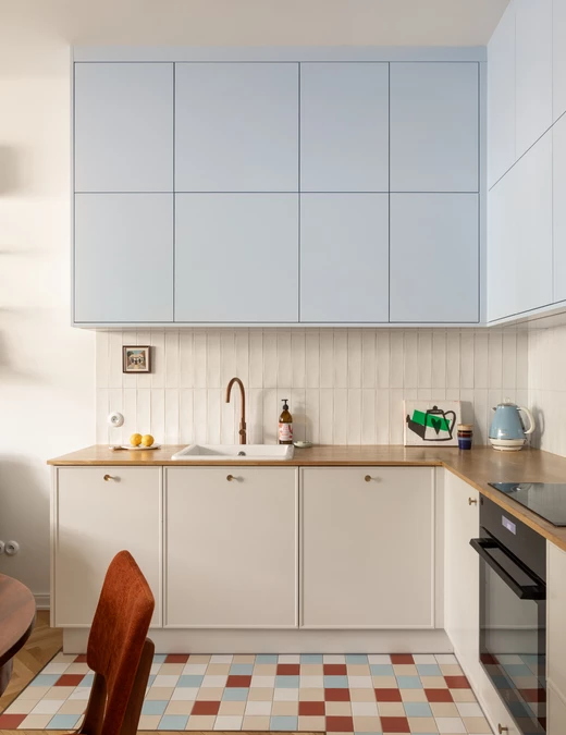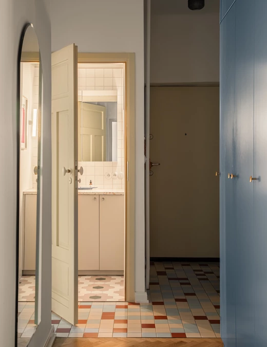 Mozaikowa posadzka w przedpokoju to hołd dla powojennej kreatywności. Wzór z drobnych, kwadratowych płytek w kontrastowych odcieniach błękitu, terakoty i beżu przywołuje ducha lat 50. i 60. XX wieku. Tego typu podłogi często powstawały z resztek płytek z różnych partii produkcyjnych, co tłumaczy ich pozorną „przypadkowość”. Projektantka zastosowała ten zabieg, by podkreślić historyczny charakter przestrzeni. Motyw mozaiki pojawia się także w kuchni i łazience, dzięki czemu spaja mieszkanie jak wizualna klamra.