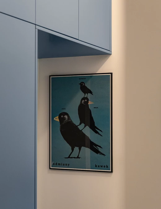 Zabudowa nad otworem wejściowym do salonu tworzy płynne przejście między korytarzem a strefą dzienną, wspierając ergonomię tak cenioną w powojennych projektach. Na ścianie zawisł plakat „Odmiany kawek” autorstwa Jakuba Zasady, który wprowadza nutę graficznego humoru i subtelnej ironii. Jego ilustracyjny charakter tworzy wizualny most między korytarzem a salonem.