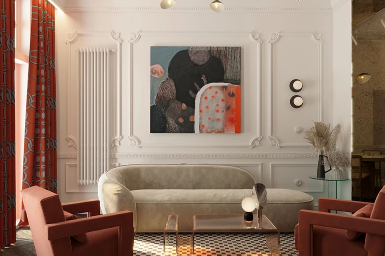 Serce salonu stanowi abstrakcyjny obraz autorstwa pochodzącej z Wrocławia, współczesnej malarki Patrycji Kryszczuk, tworzącej pod pseudonimem KRY_. Okna zdobią zasłony z kolekcji Hermesa, zaś w części jadalnianej króluje stół polskiej marki MAAVO.