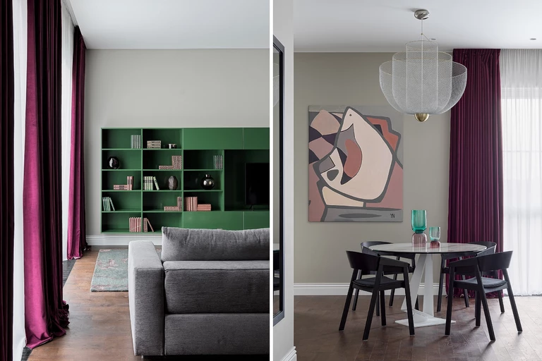 Aizhan Kunayeva z pracowni Akka Interiors, autorka projektu wnętrza tego 120-metrowego mieszkania zlokalizowanego w Kazachstanie, wykreowała przestrzeń daleką od banału. Pomimo użycia w aranżacji palety wyrazistych kolorów, takich jak fiolet czy zieleń, wnętrze ma wyważony i harmonijny charakter.