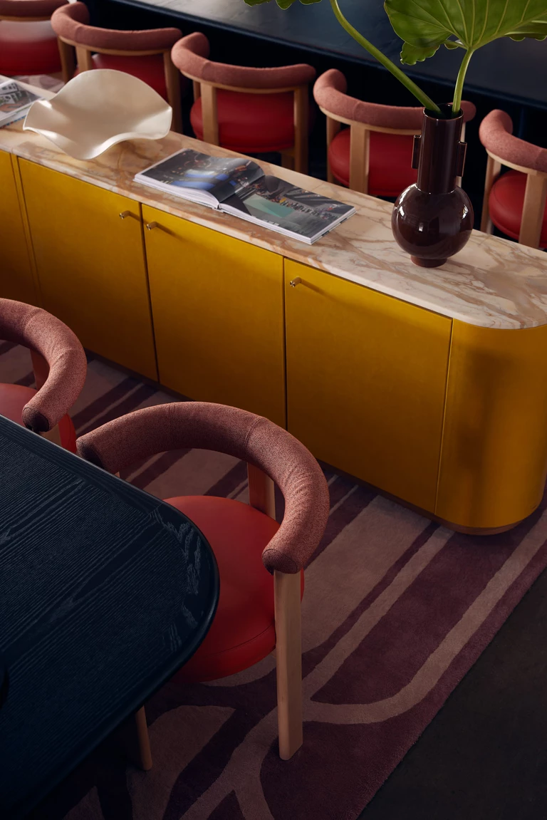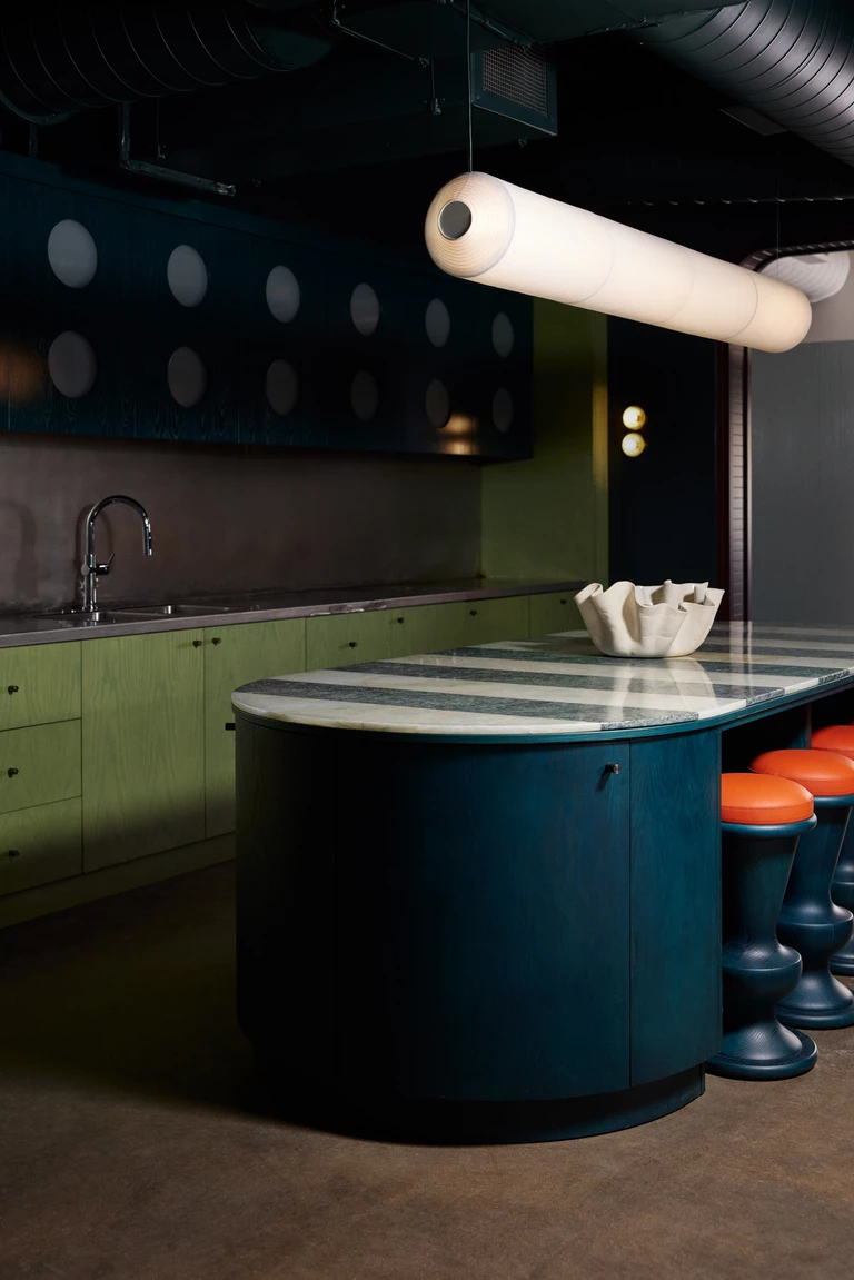 Projekt Lafferty uchwycił rytm i charakter Nashville, tworząc wnętrza, które zapraszają do komfortowej pracy i wspierają kreatywność. Materialność odgrywa tu kluczową rolę. Dotykowa faktura palisandru, mosiądzu i terrazzo spotyka się z ciepłem, jakie dają warstwy boucle i aksamitu. Światło dynamicznie gra na ścianach pokrytych tynkiem wapiennym i lakierowanych szafkach, nadając przestrzeni żywy, niemal domowy charakter przez cały dzień.