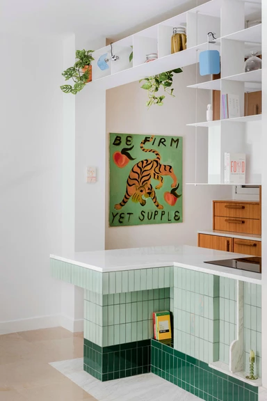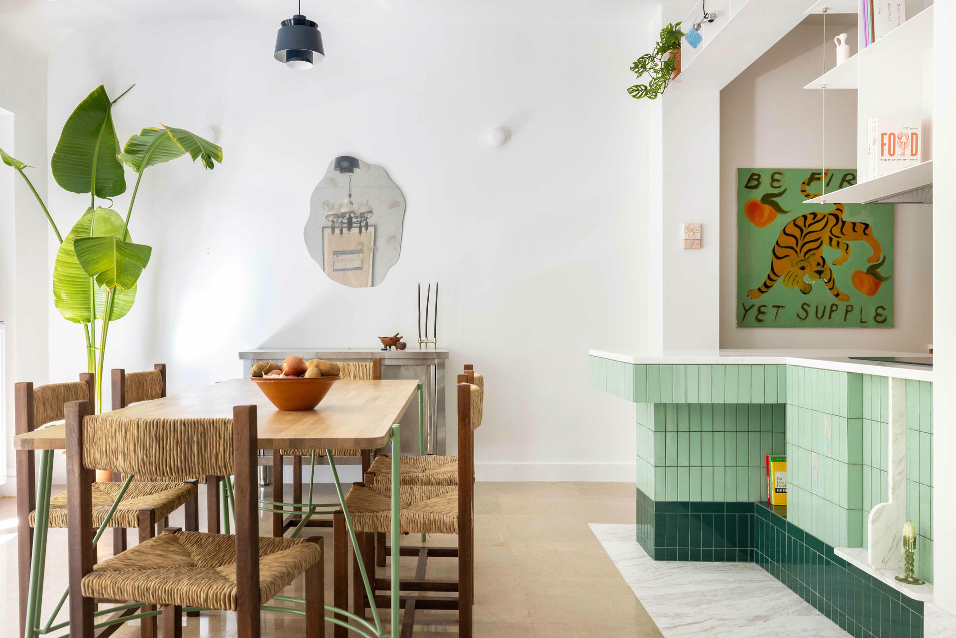 Sercem codziennego życia jest kuchnia. Duża wyspa, wykończona płytkami, jest łącznikiem między strefami. Umieszczenie płyty grzewczej bezpośrednio na jej blacie pozwala łączyć gotowanie z innymi aktywnościami. W dolnej części mebla zaprojektowano wnęki i marmurowe półki, które mieszczą zarówno sprzęty, jak i książki czy obiekty artystyczne. Z kolei nad wyspą zawieszono metalową konstrukcję z półkami, która definiuje granicę między kuchnią a jadalnią i wprowadza grę światła.