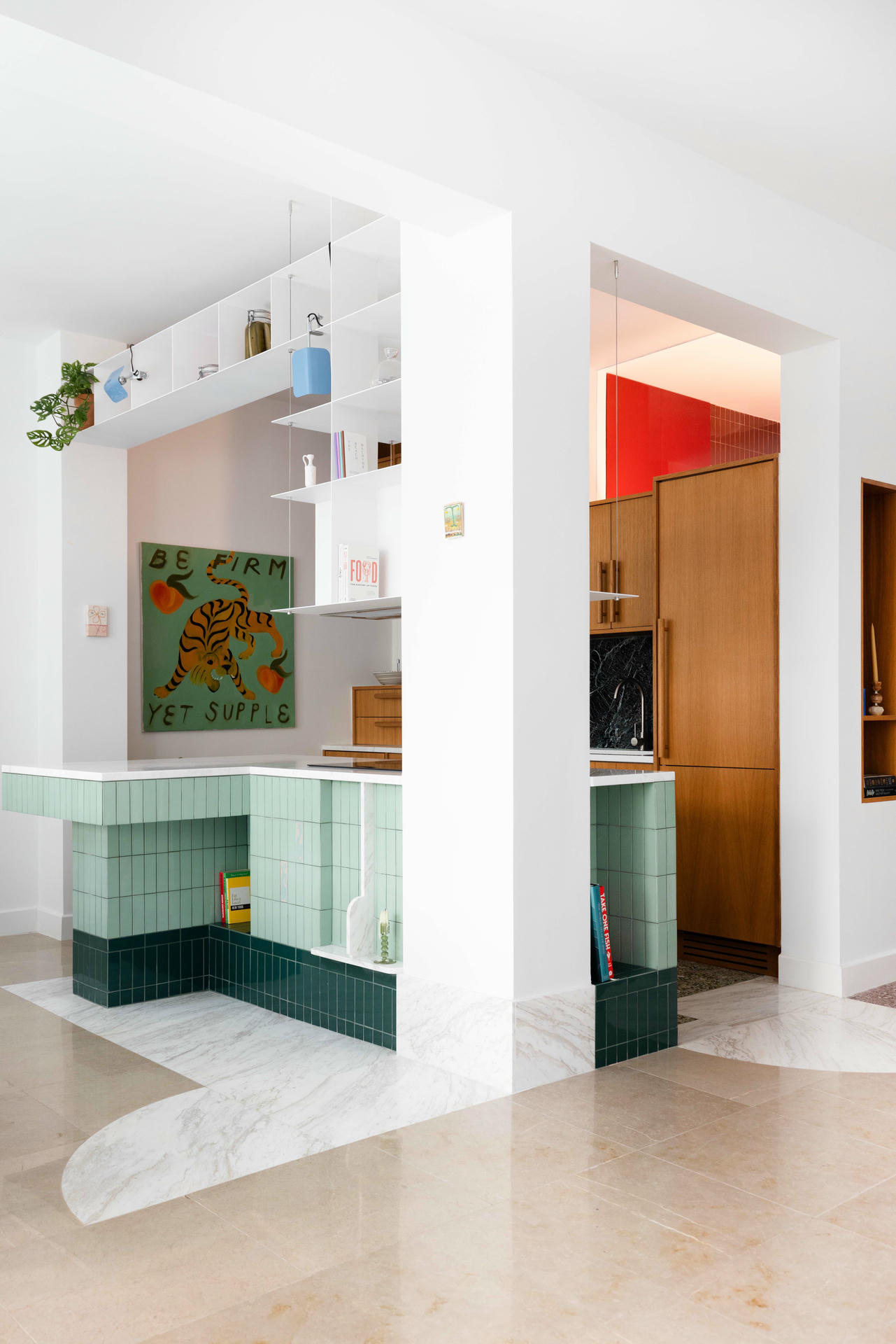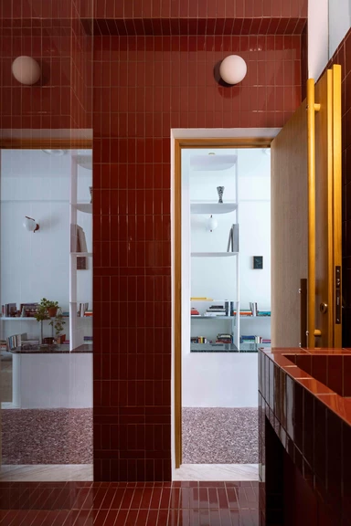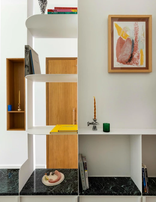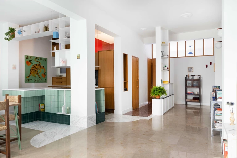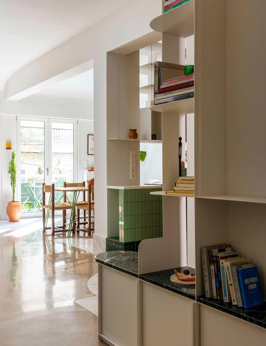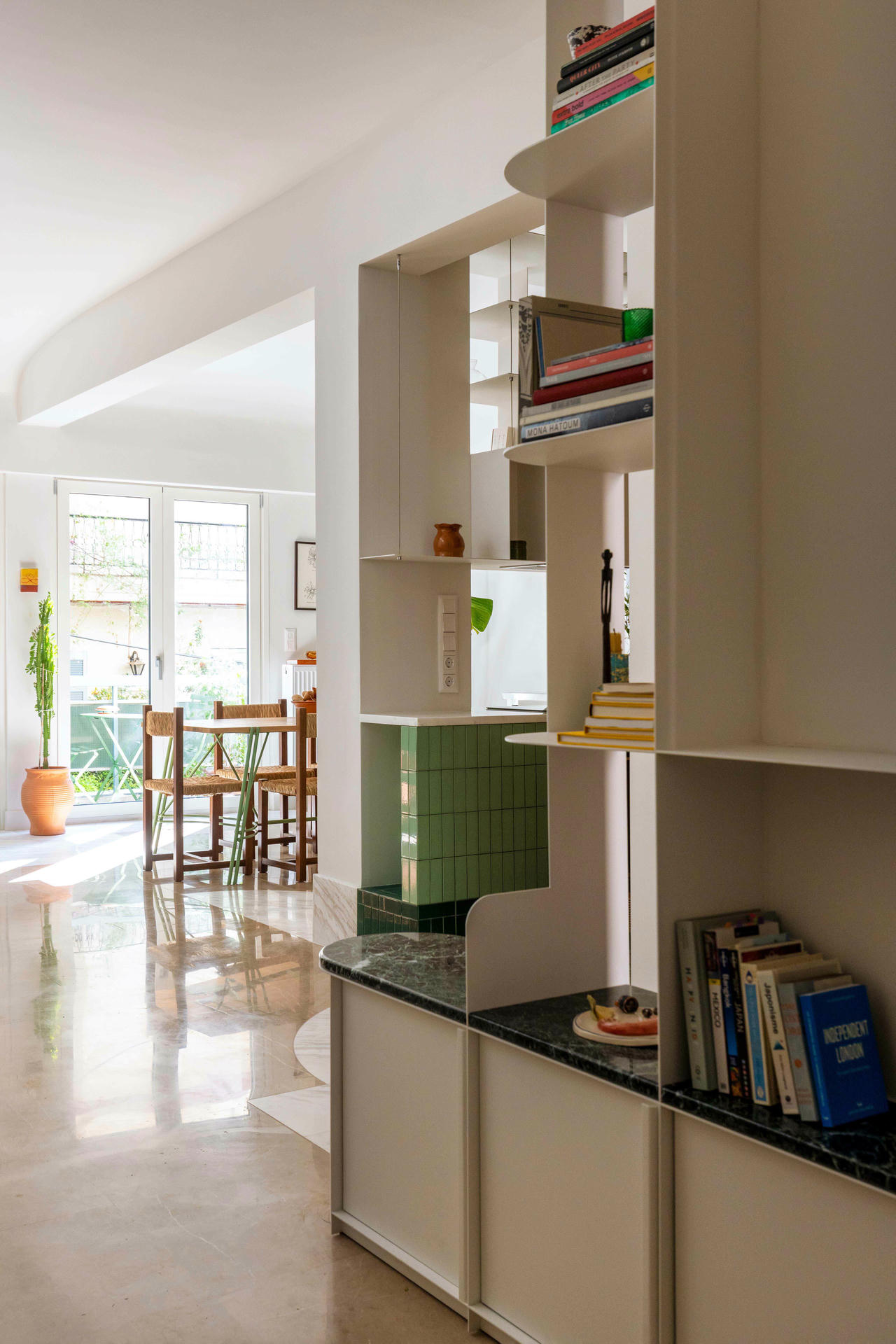 Zachowano i odrestaurowano oryginalne elementy, takie jak brązowe marmury, kolorowe posadzki terrazzo czy rzeźbioną marmurową umywalkę. Jednocześnie układ funkcjonalny został gruntownie przeorganizowany. Usunięcie podłużnych ścian działowych pozwoliło otworzyć przestrzeń i wprowadzić więcej światła w głąb mieszkania. Salon, jadalnia, kuchnia i strefa wejściowa zaczęły funkcjonować jako całość.