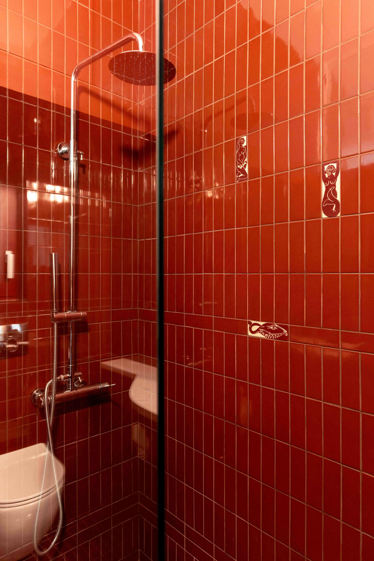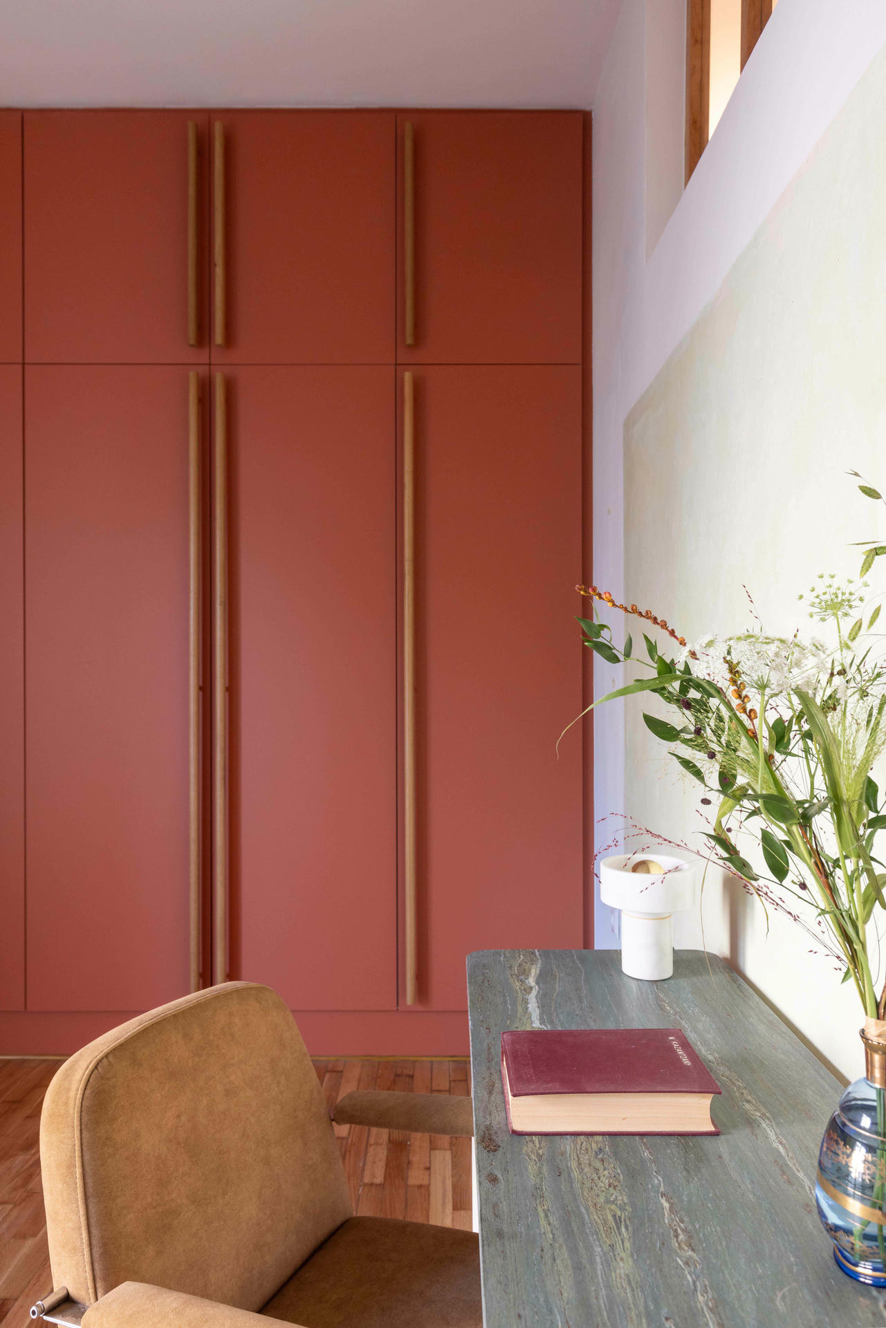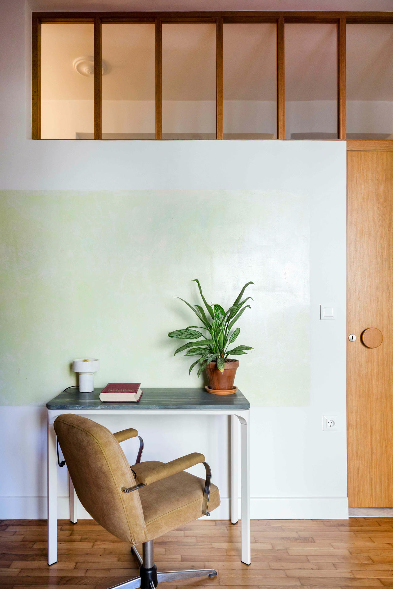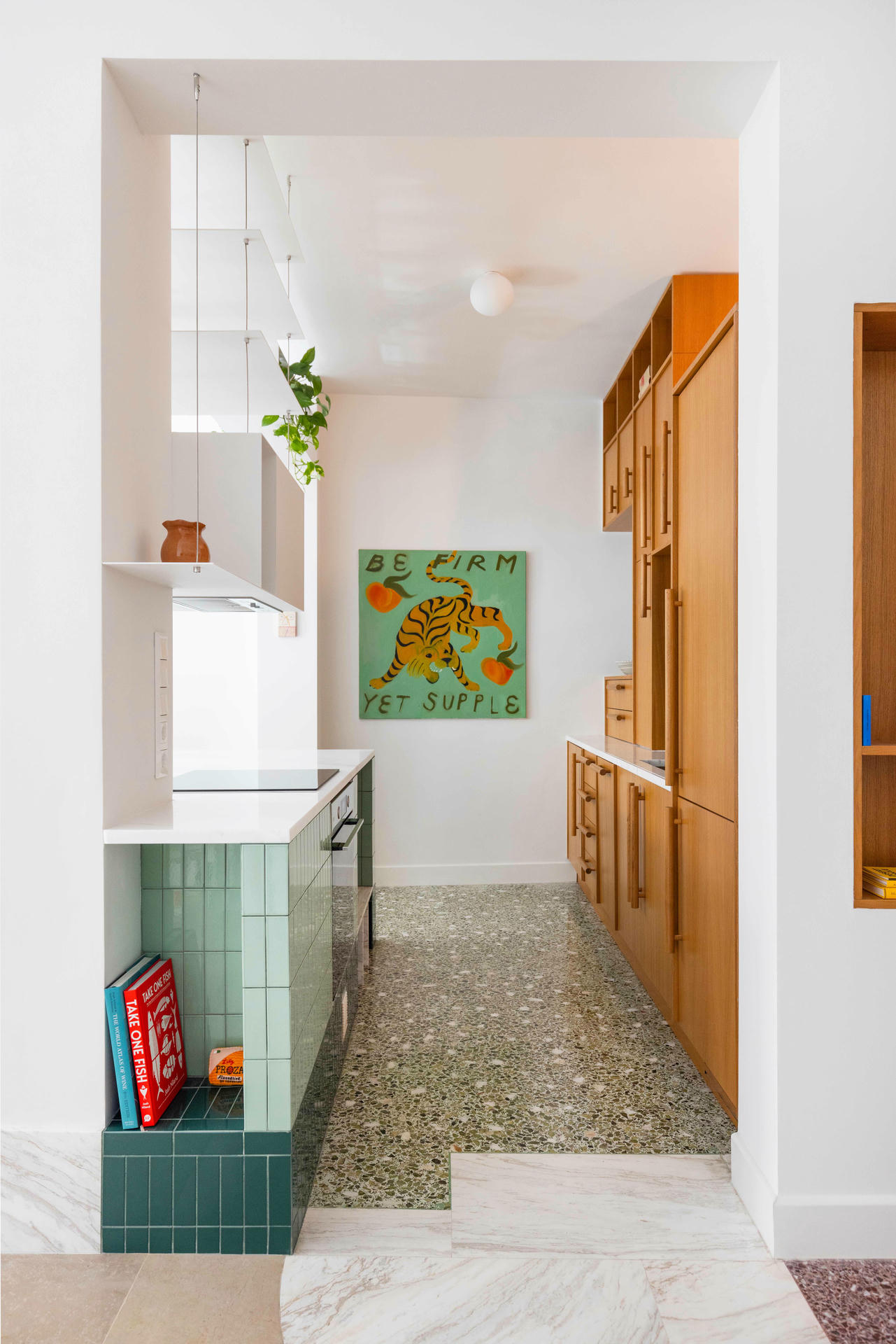 Zachowano i odrestaurowano oryginalne elementy, takie jak brązowe marmury, kolorowe posadzki terrazzo czy rzeźbioną marmurową umywalkę. Jednocześnie układ funkcjonalny został gruntownie przeorganizowany. Usunięcie podłużnych ścian działowych pozwoliło otworzyć przestrzeń i wprowadzić więcej światła w głąb mieszkania. Salon, jadalnia, kuchnia i strefa wejściowa zaczęły funkcjonować jako całość.