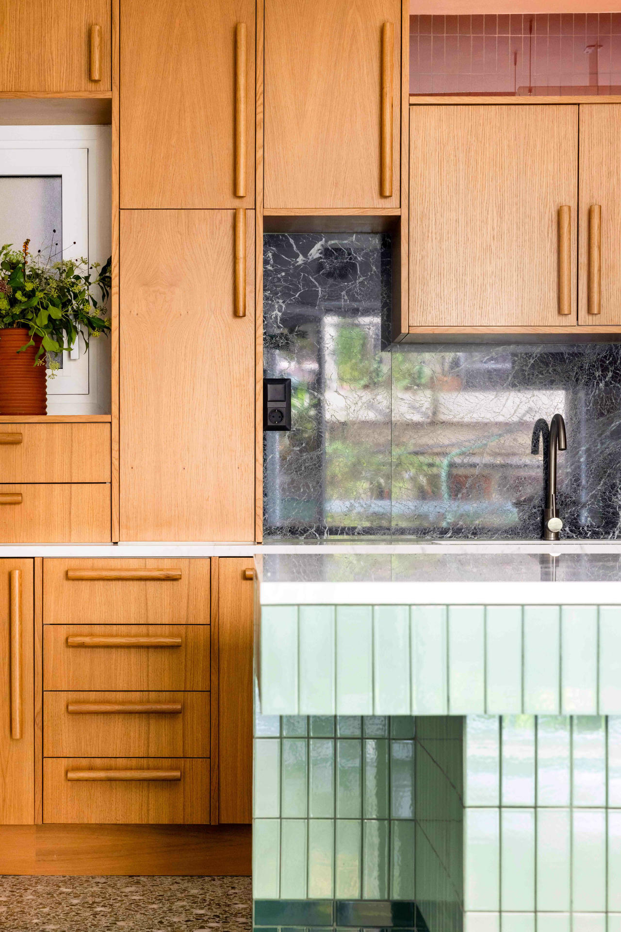 Tło dla wyspy tworzą szafki z forniru dębowego w ciepłym, miodowym odcieniu. Ich forma została dostosowana do istniejącego okna szybu wentylacyjnego oraz nowych przeszkleń, które doświetlają wcześniej ciemne fragmenty mieszkania, w tym łazienkę.