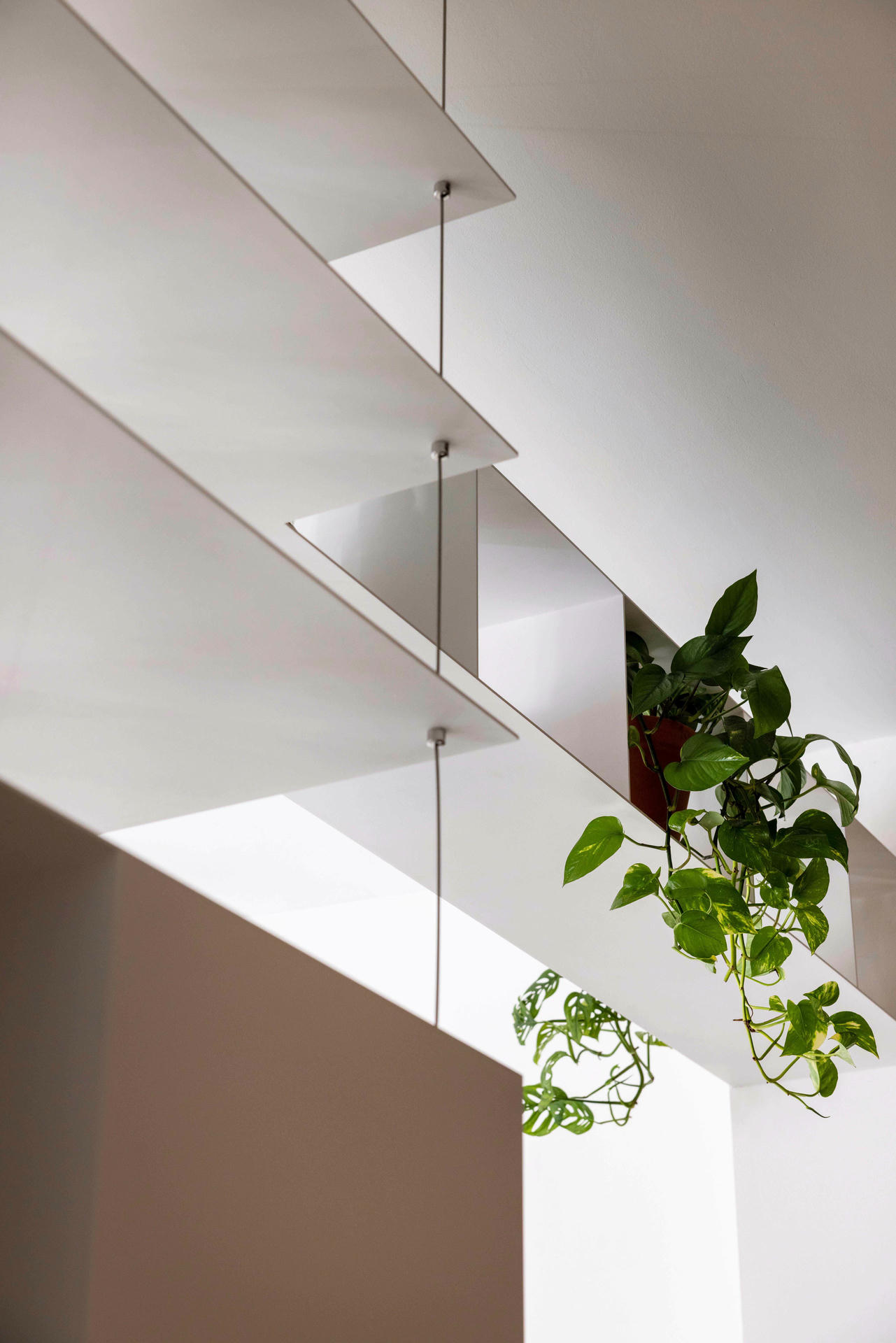 W otwartej strukturze części dziennej ważną rolę odgrywają elementy zaprojektowane specjalnie dla tego wnętrza. Już przy wejściu pojawia się charakterystyczna biała konstrukcja metalowa, ustawiona w miejscu dawnej ściany. Jej zestawienie z zachowanym fragmentem ceglanego muru tworzy kontrast i – co najważniejsze – pierwszą przestrzeń dla ekspozycji sztuki.