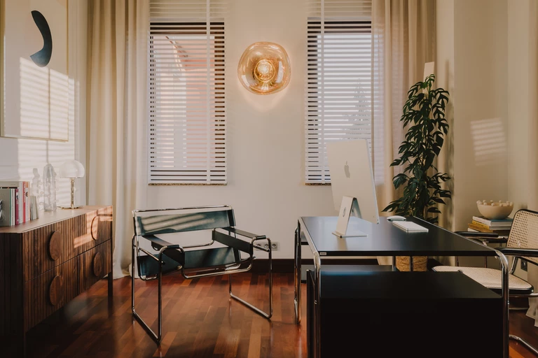 Projekty Marcela Breuera, Ludwiga Mies van der Rohe i Toma Dixona w towarzystwie porannego zimowego światła stanowią niepowtarzalne połączenie. Za tę klimatyczną aranżację domowego gabinetu odpowiada Agata Pierożyńska z pracowni Habitat Wnętrza.